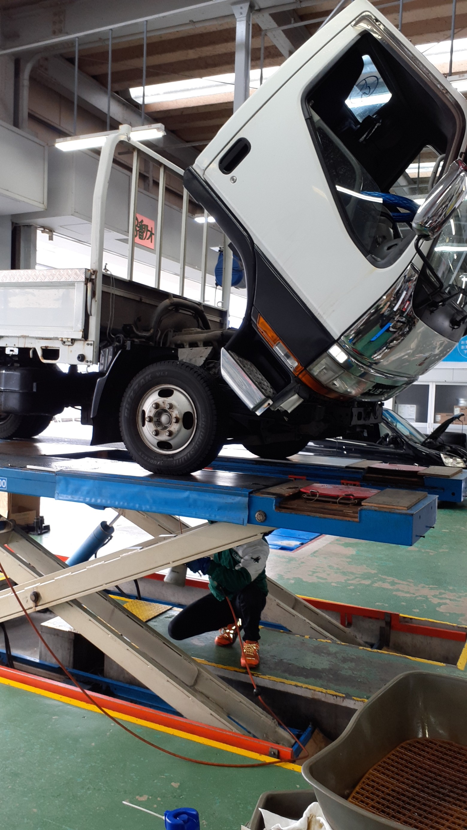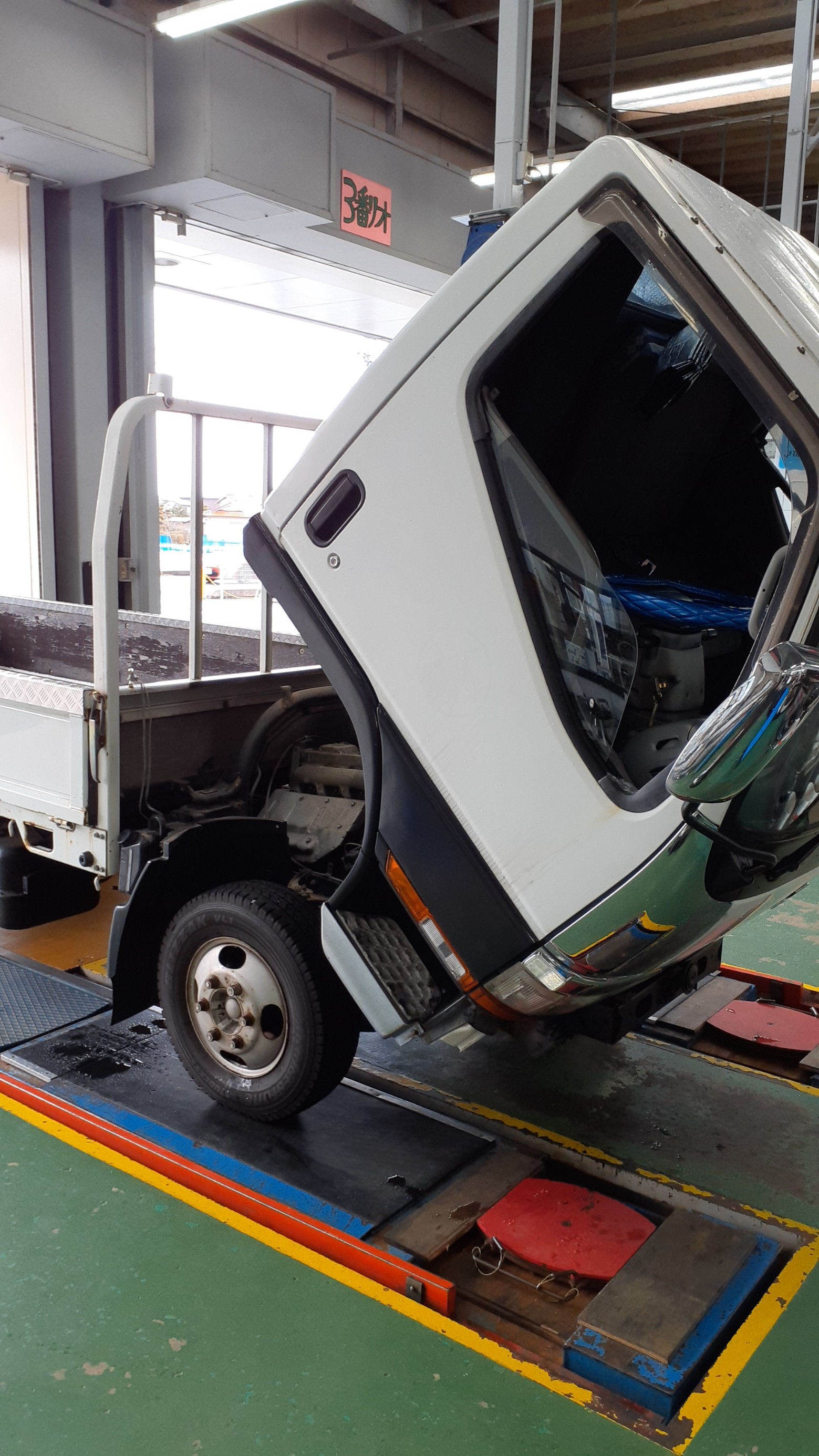 トラックの場合、先ずはキャビンを起こして作業をします。