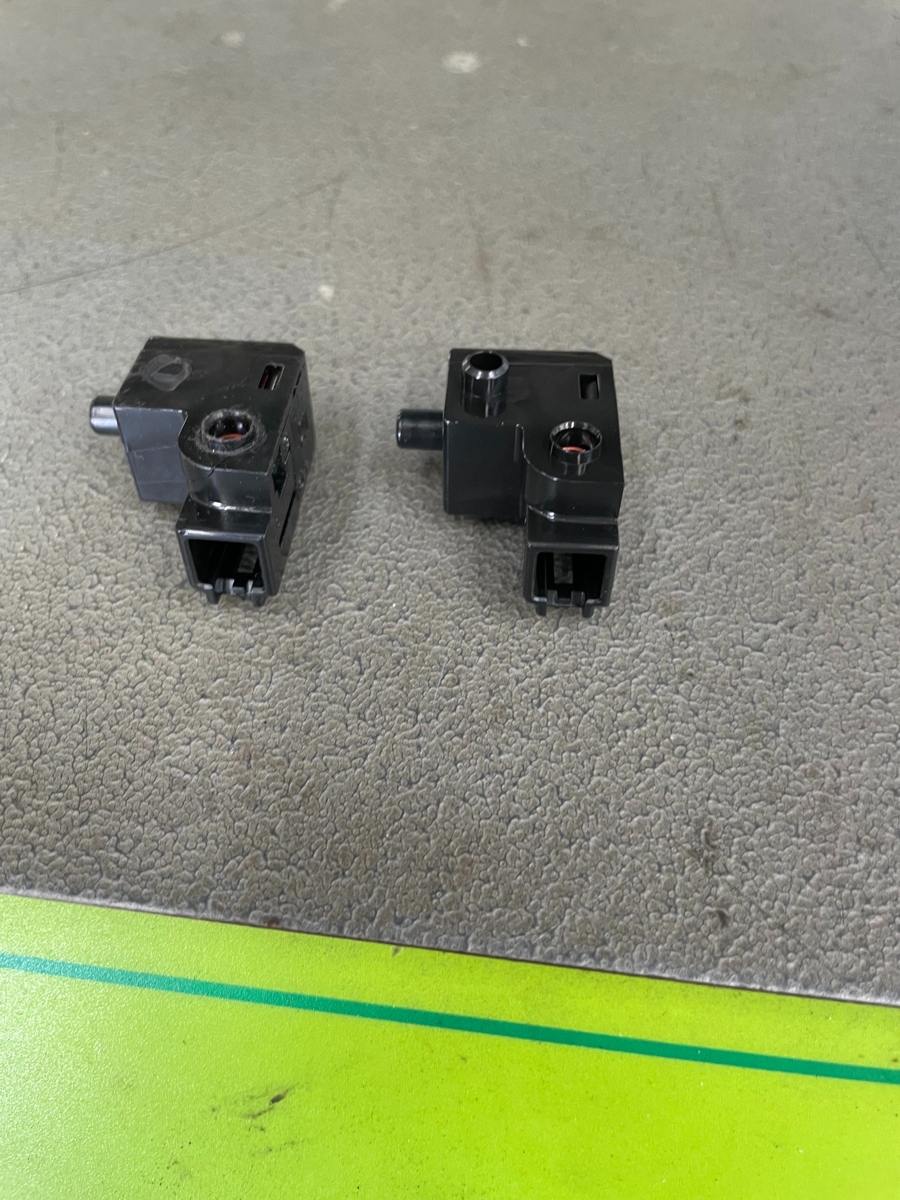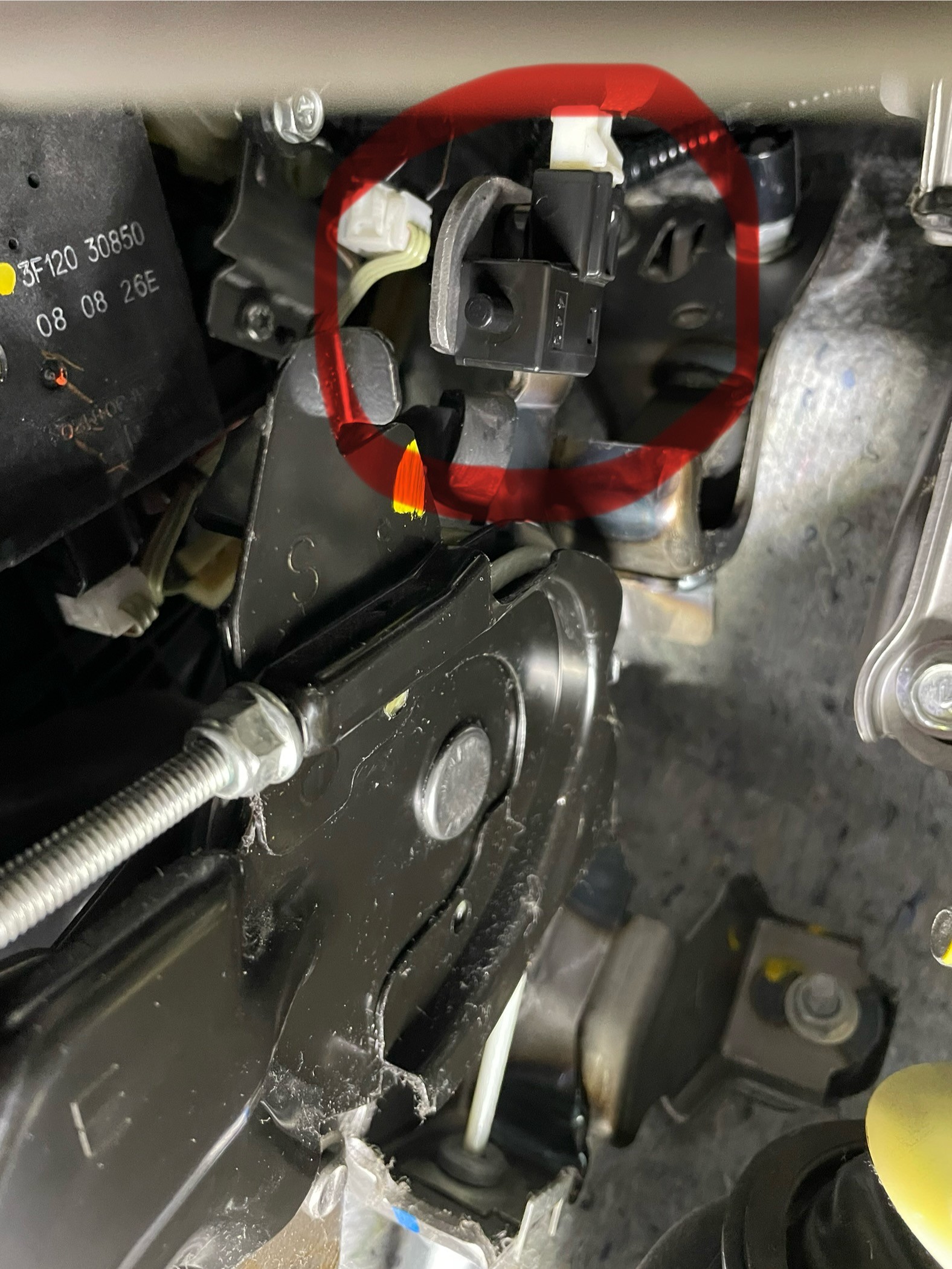 もしやと思い、運転席足元のサイドブレーキ部分を覗いてみると、案の定”サイドブレーキランプスイッチ”が劣化して外れてしまっていました。