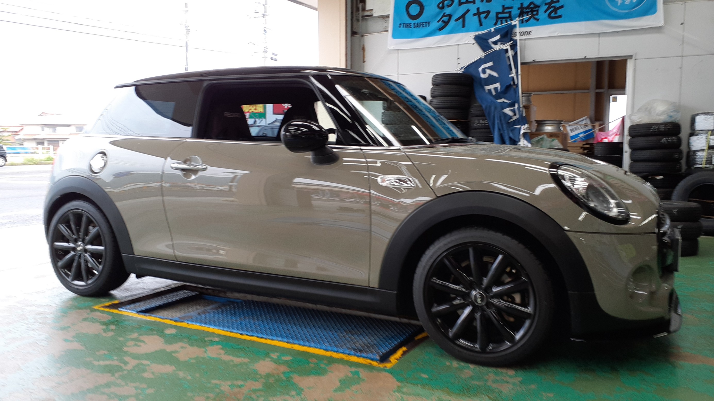先日のスプリングフェアで阿部商会さんのデモカーのMINIに乗っていただき感動されて、同じ仕様にされたいとの事で、ビルシュタインの車高調とアムゼックスのホイールを付けさせていただきました(⌒∇⌒)