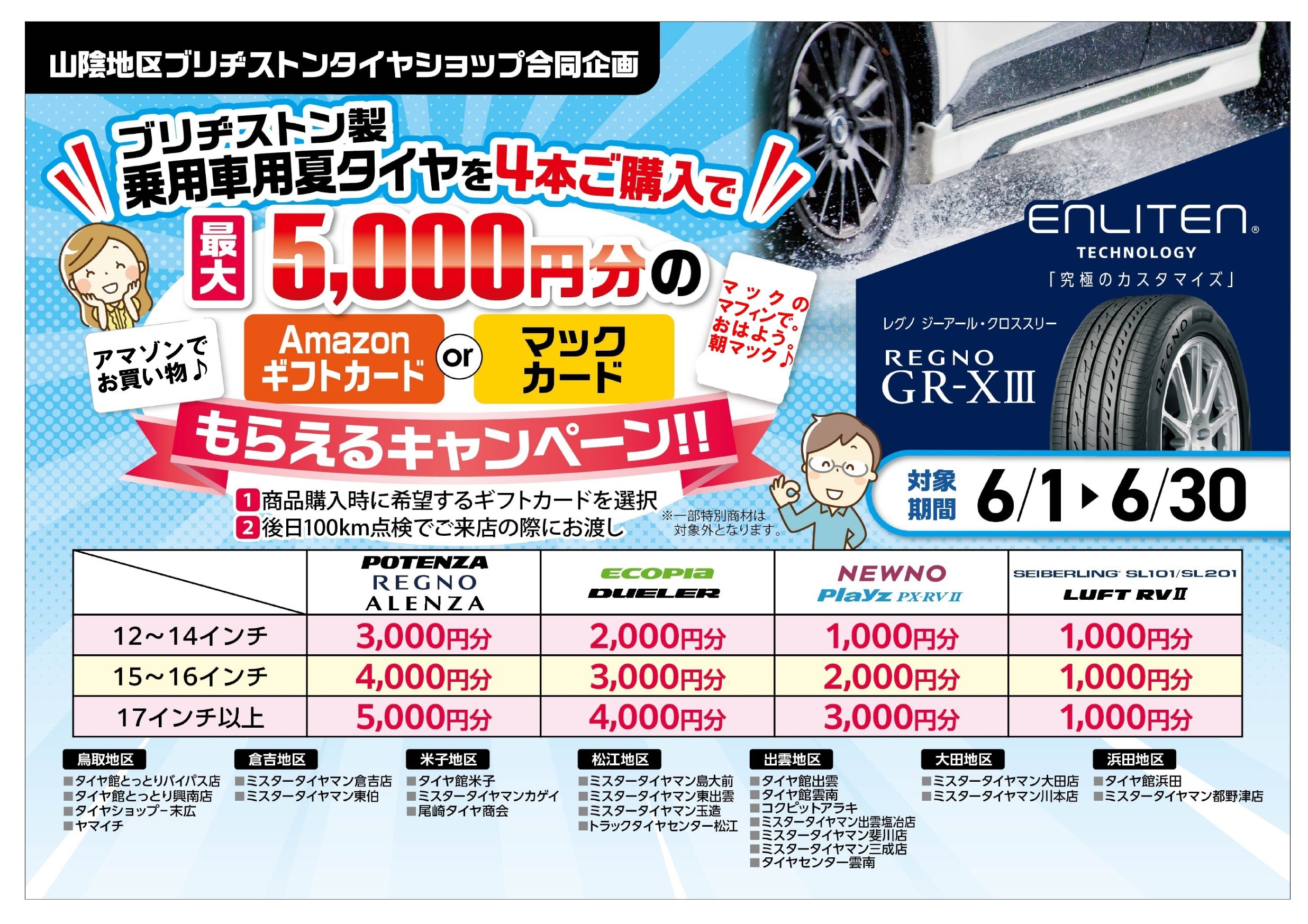 山陰地区限定!!キャンペーン開催中!! ポスト 2024年6月6日 現在当店ではブリヂストン製乗用車用夏タイヤご購入の方にギフト券プレゼントキャンペーンを開催中です♪ 対象期間中【6/1~6/30】にご成約のお客様にギフト券をプレゼント!! 夏タイヤの購入を検討中の方、この機会にご来店お待ちしております。 担当:大野