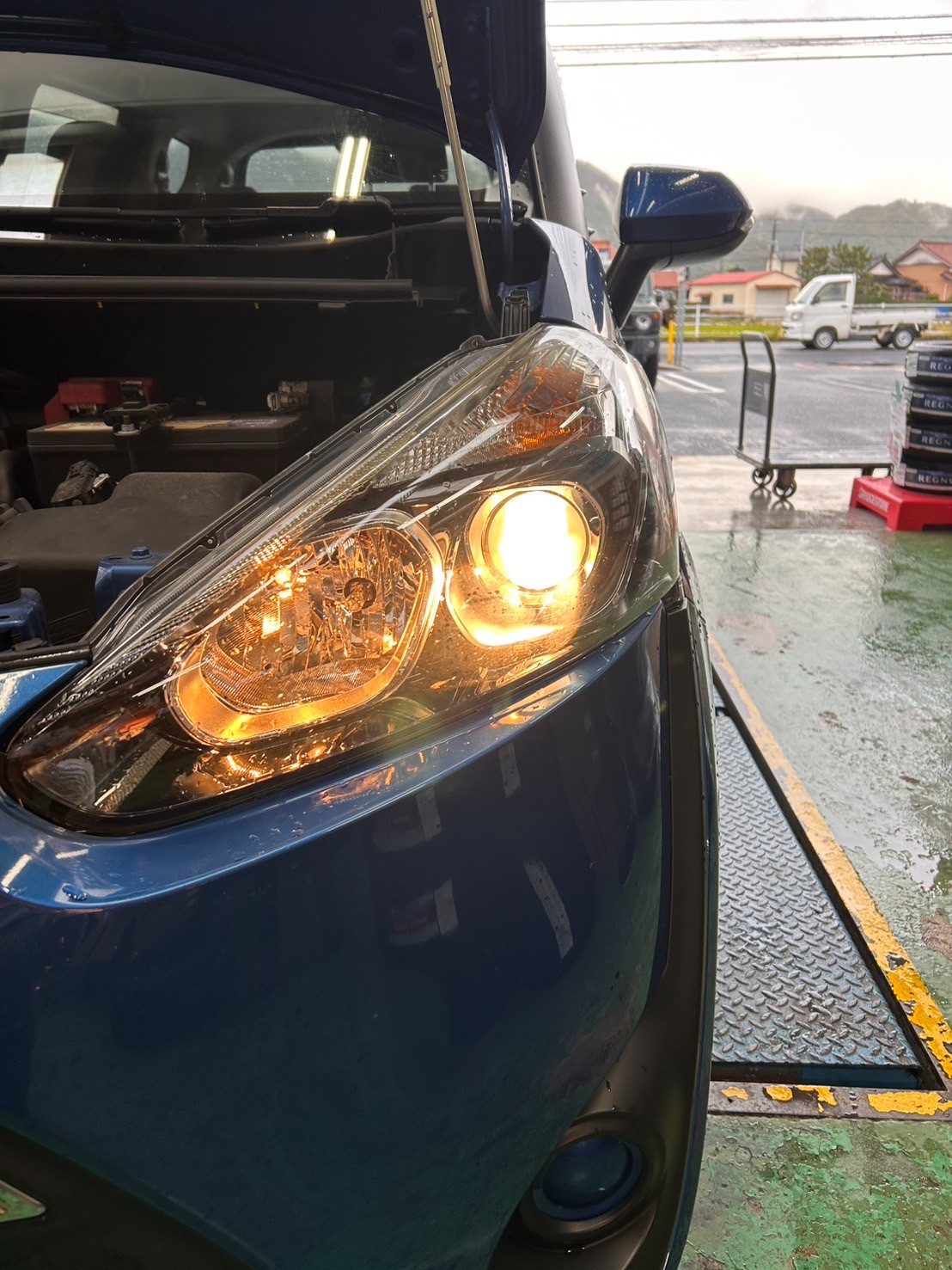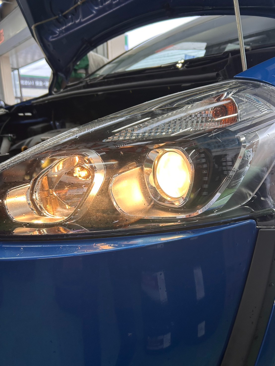 純正のヘッドライトはプロジェクター式ですが、ハロゲン球のため、色は黄色っぽくて暗い、、、(ーー;)