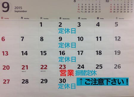 シルバーウィーク期間中の23日水曜日は臨時営業とし、