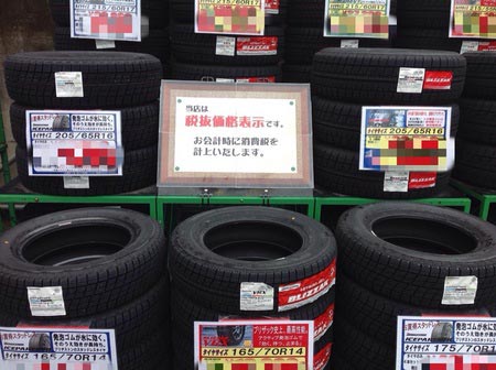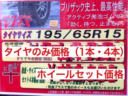 プライスカードには、上段に「タイヤのみ価格(1本・4本/税抜き)」を、
