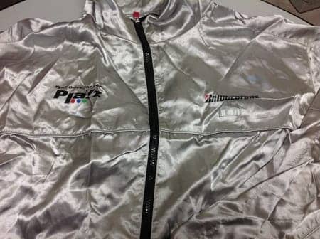 その年の新商品のイメージカラーと、ブランドロゴが目を引くブルゾンですが、