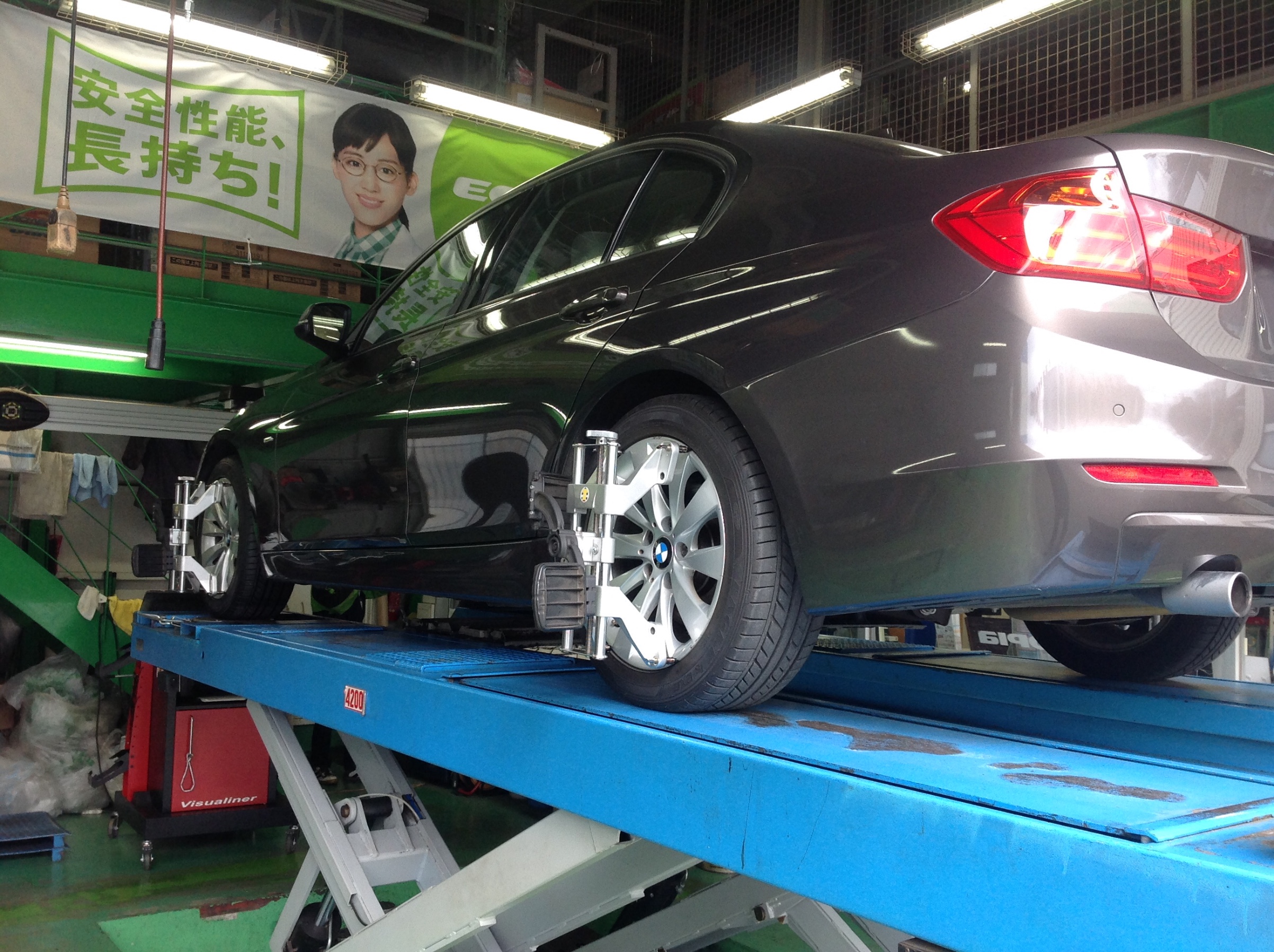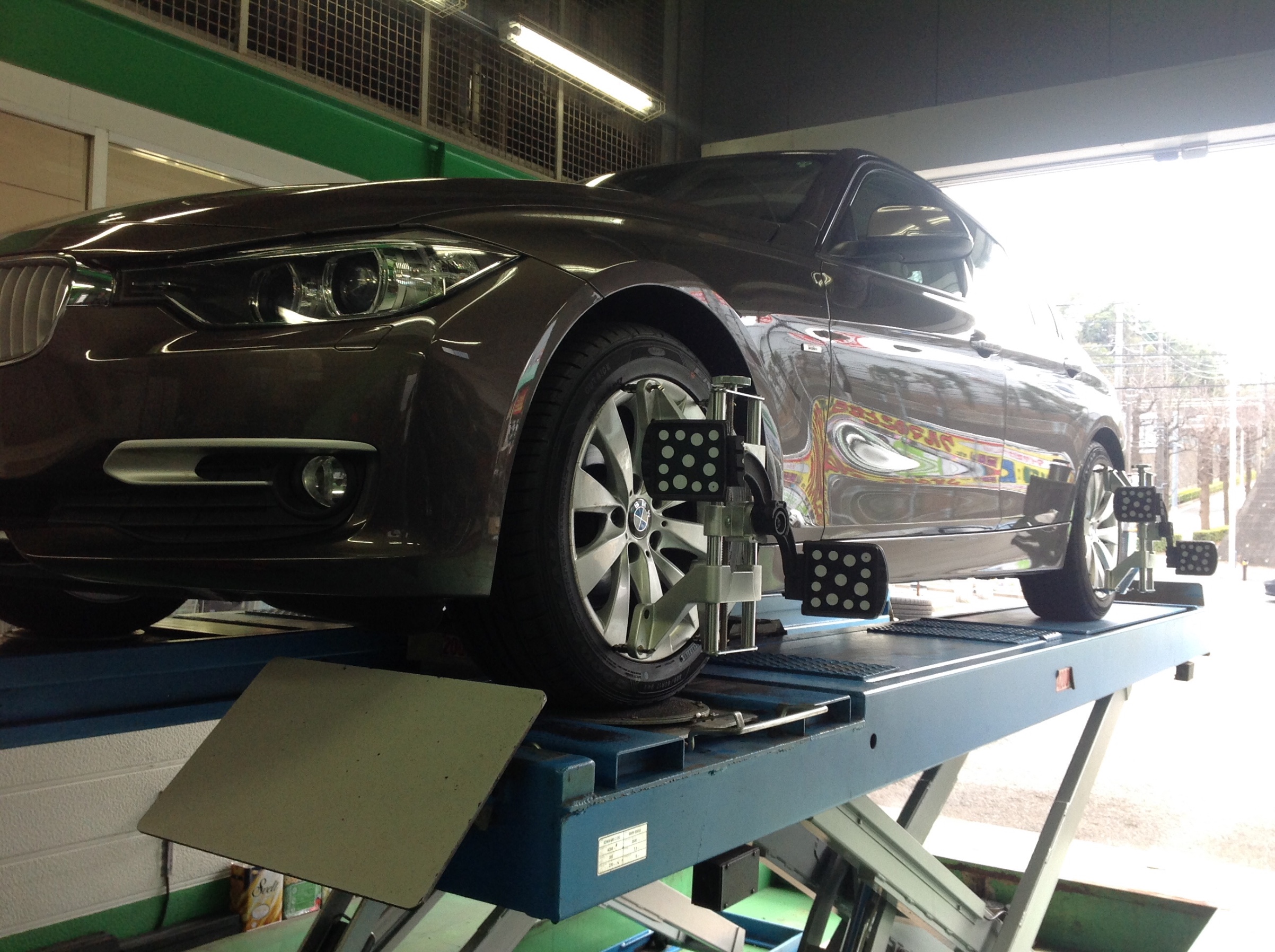 今日はBMW F30型3シリーズのアライメントをやります。