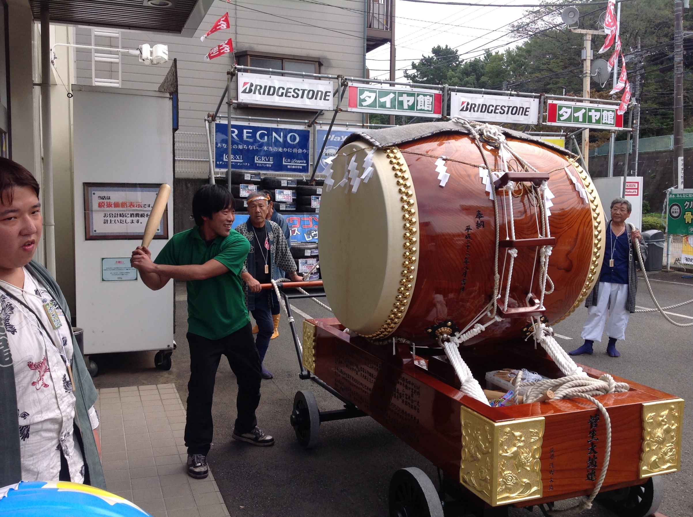 毎年大太鼓が廻ってきて、スタッフ一同叩かせていただくのが恒例となっておりますが、今年入社の小池くんが初参加。