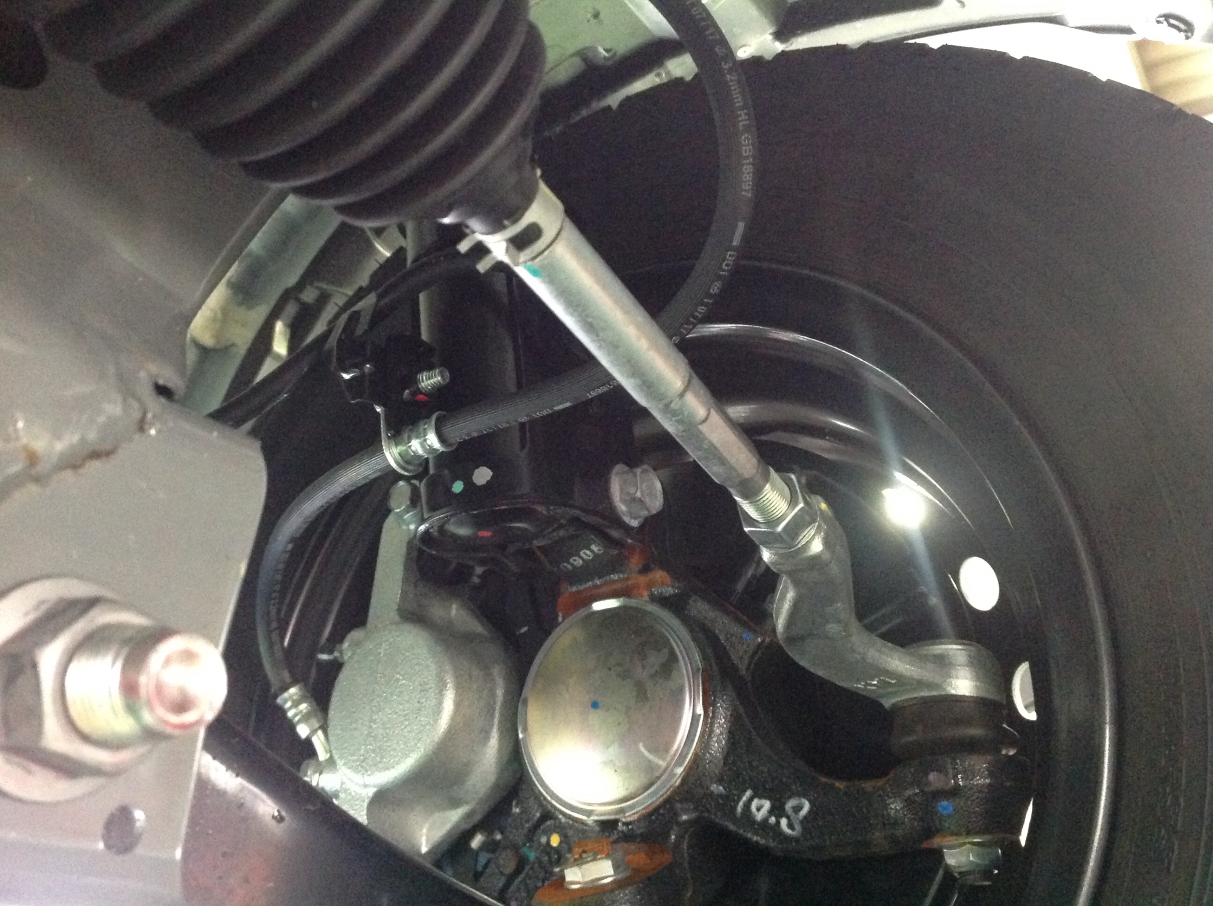 この車は通常の調整機構ではフロントトーしか調整できないのですが、キャンバーの左右差などがあり、車が左に流れていく状態でしたので、ストラットボルトのガタを利用してキャンバーの左右差を縮めてから調整しました。