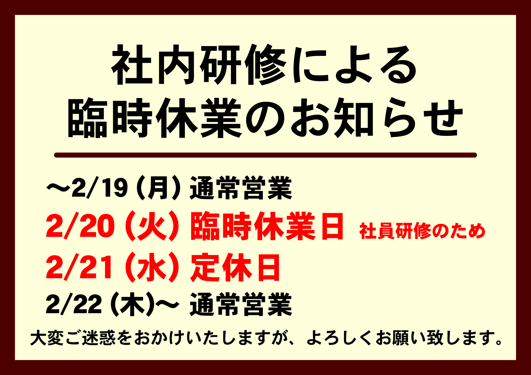 掲題の通り、2月20日(火)を社員研修のため、臨時休業とさせていただきます。