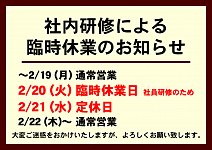 掲題の通り、2月20日(火)を社員研修のため、臨時休業とさせていただきます。 22日(木)より通常営業いたします。 お客様にはご不便、ご迷惑をお掛けいたしますが、何卒ご了承くださいますよう、お願い申し上げます。