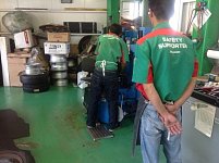 鬼教官が新人のタイヤ組みの練習を見ています。 その眼鏡の奥には冷酷に鋭く光る眼差しが•••!! 凍てつく波動の様な視線を浴びて 「早くこの緊張感から解放されたい!(>人<;)」 と、一生懸命練習をして一人前のタイヤマンとして成長するのです。