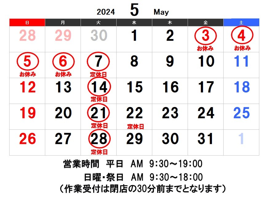 5月の定休日並びにGW期間中の休業日についてのお知らせです。 5月のお休みは 3日(祝) 4日(祝) 5日(祝) 6日(祝) 7日(火) 14日(火) 14日(火) 21日(火) 28日(火) となります。 営業時間は 平日 9:30~19:00 (受け付けは閉店30分前18:30まで) 日...