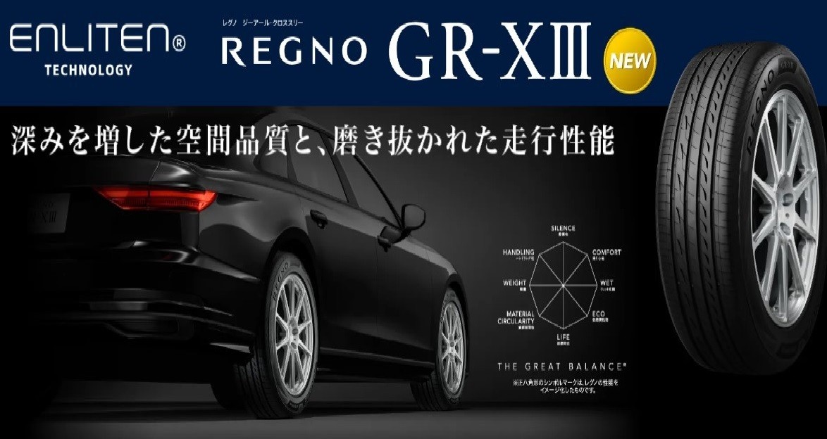 2月より発売されました待望の新商品「レグノGR-XⅢ」 発売以来多くのお客様に好評をいただいております。 GR-XⅢは新ゴム“GR-tech Silentゴム”の搭載により振動を吸収しロードノイズを更に低減しました。 新品比較での騒音逓減率は先代GR-XⅡに対してGR-XⅢは荒れたアスファルトでに気になりやすいロー...