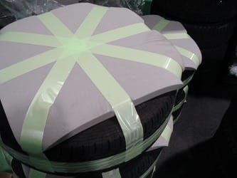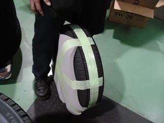 お客様の大切なタイヤホイールを緩衝材で保護した後に