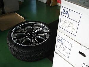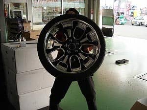 暑さも苦にせずタイヤホイールを組んでます、身長171cmの牧が