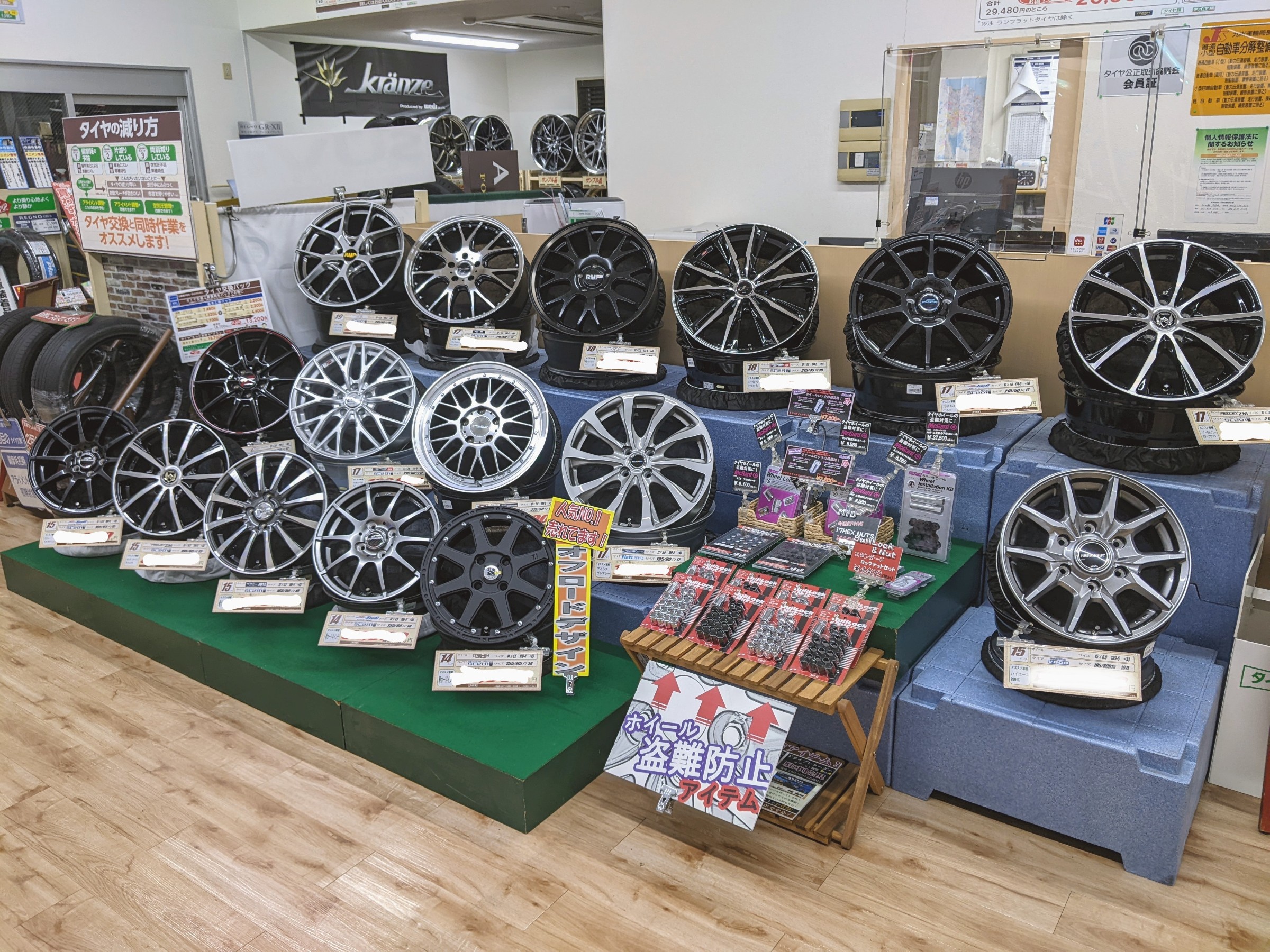 店内入ってすぐに大量展示中です。気になる方は、タイヤ館次郎丸まで見に来てね!!