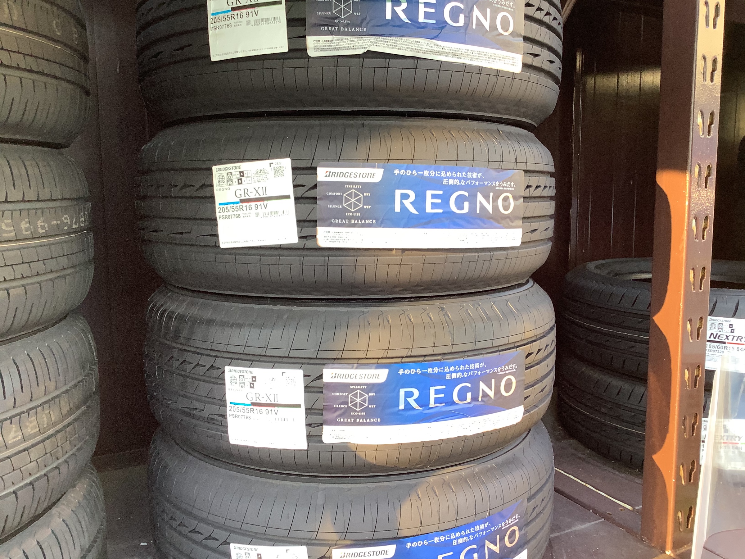 タイヤはREGNO GR-XII 205/55R16です。タイヤの摩耗にてご来店頂きました!タイヤはお客様ご希望でREGNOになりました♪その際お話を伺っていると、ハンドルセンターがズレているということでしたので、アライメントの説明をさせて頂き、ハンドルセンターを直させて頂き、トゥもバッチリ合わさせて頂きました!!