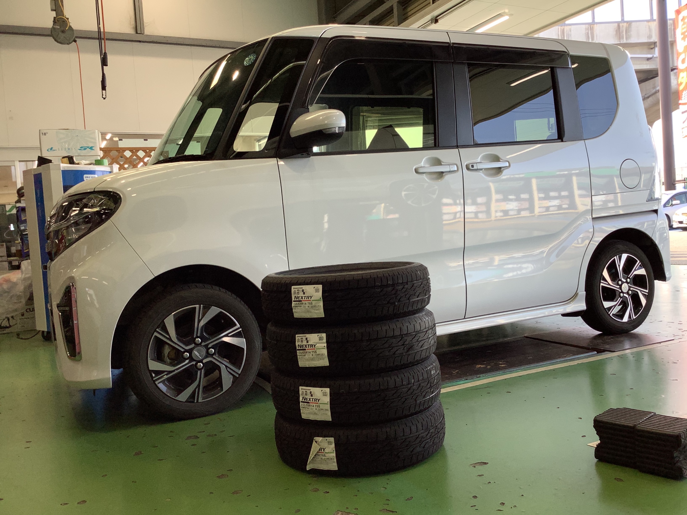 タイヤはNEXTRY 155/65R14です。タイヤ館Webの秋のメガ特セールを見てご来店頂きました!タイヤが交換時期で、NEXTRYにタイヤ交換をしたいという事でした!秋のメガ特セールのクーポンも使わせて頂き今回交換させていただきました♪