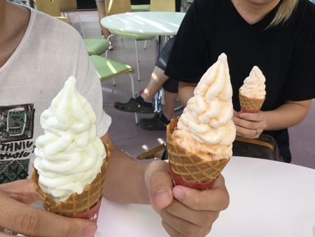 家族でドライブ♪ ポスト 2016年8月21日 今日はお休みいただきましたので、家族でドライブしてきました(^-^)菊池のお店に行きたいと言うので、途中の道の駅に寄ってきました。以前行ったときに食べたソフトクリームが美味しかったので、息子にも食べさせてやりたいと思いまして。寄ってきたのは「道の駅 七城メロンドーム」果肉ゴロゴロのソフトクリームがとても美味しかったです(^-^)青メロンと赤メロンがあり、青の方が後味スッキリです♪おすすめですよ(^_^)v 担当:工場長
