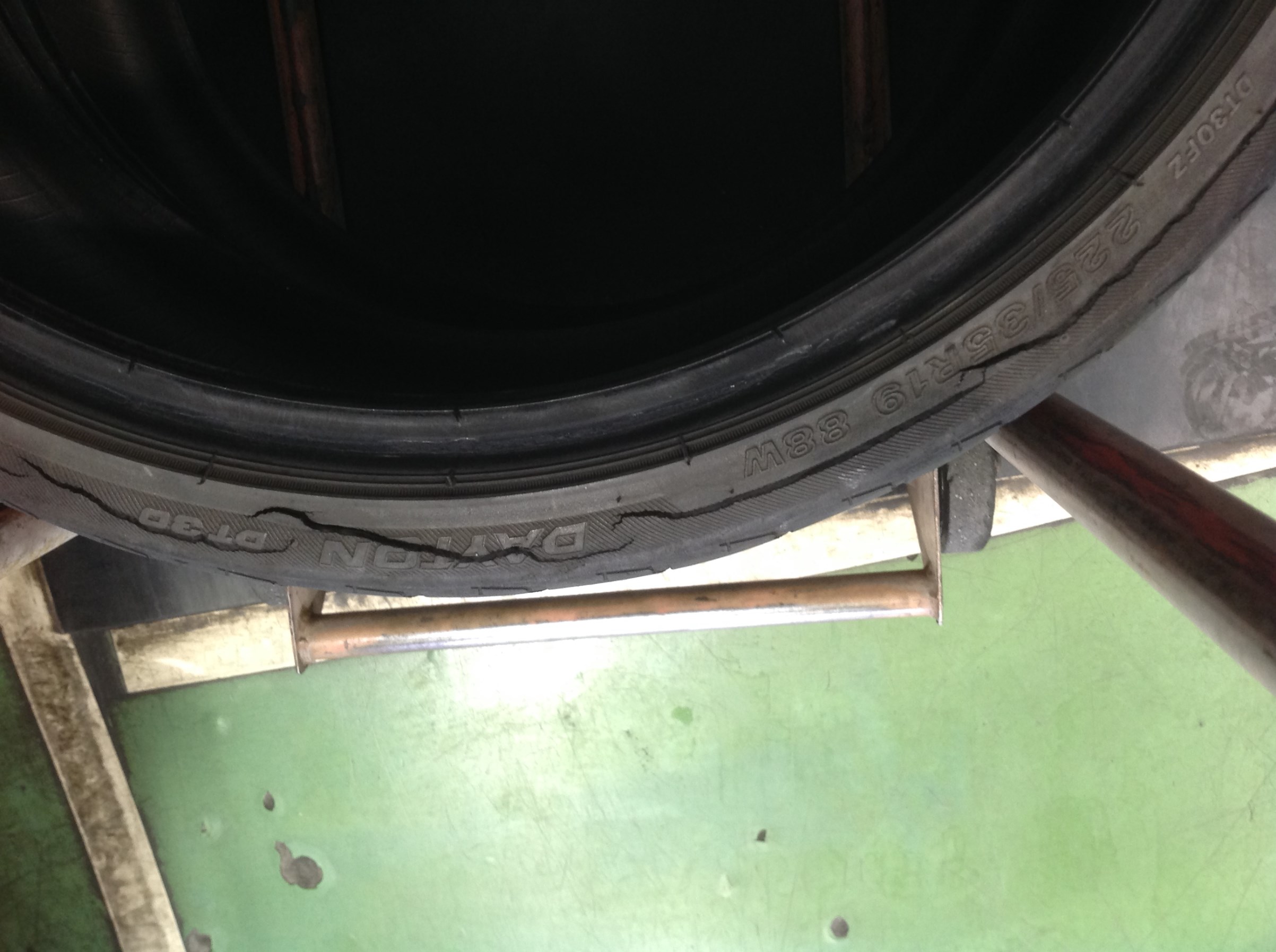 原因は、おそらく経年劣化によるヒビ割れと空気圧不足によるモノだと思われます。