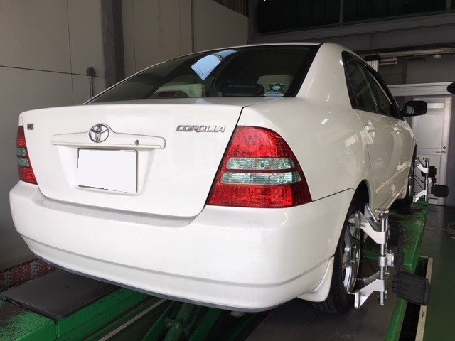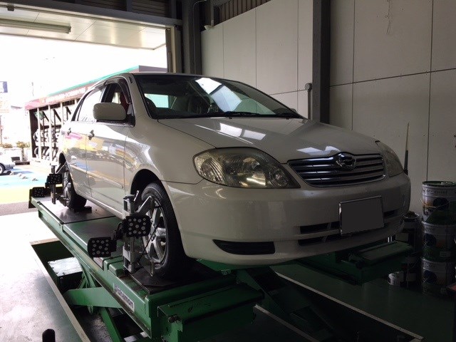 カローラ NZE121 タイヤ交換 アライメント調整 ポスト 2018年2月22日 カローラにお乗りのK様、 不注意でぶつけてしまったらしく、 左前のタイヤとホイールをガリガリっと・・・(T_T) 点検の結果、傷はたいした事無いのですが、 タイヤは既に限界まで消耗しており、4本とも交換です。 それと、ぶつけてしまったとなると心配なのがアライメント アライメント測定中・・・ 案の定、ズレが出ており要修正 (~_~) K様、よそ見運転には注して下さいネ! 担当:牧
