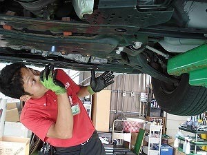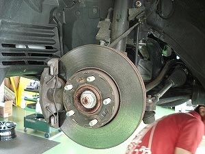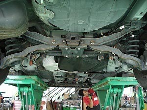 車両をリフトで上げて下回りの点検、タイヤを外して