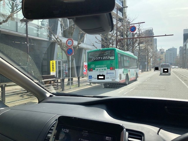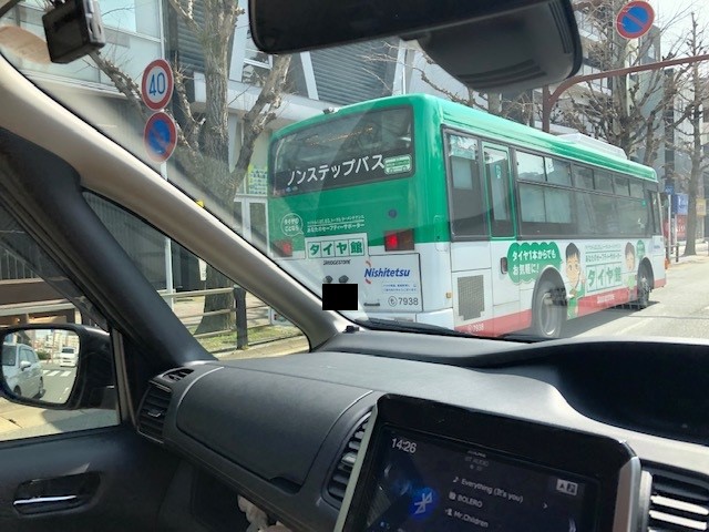 天神付近を走行中、タイヤ館バスと遭遇しました。