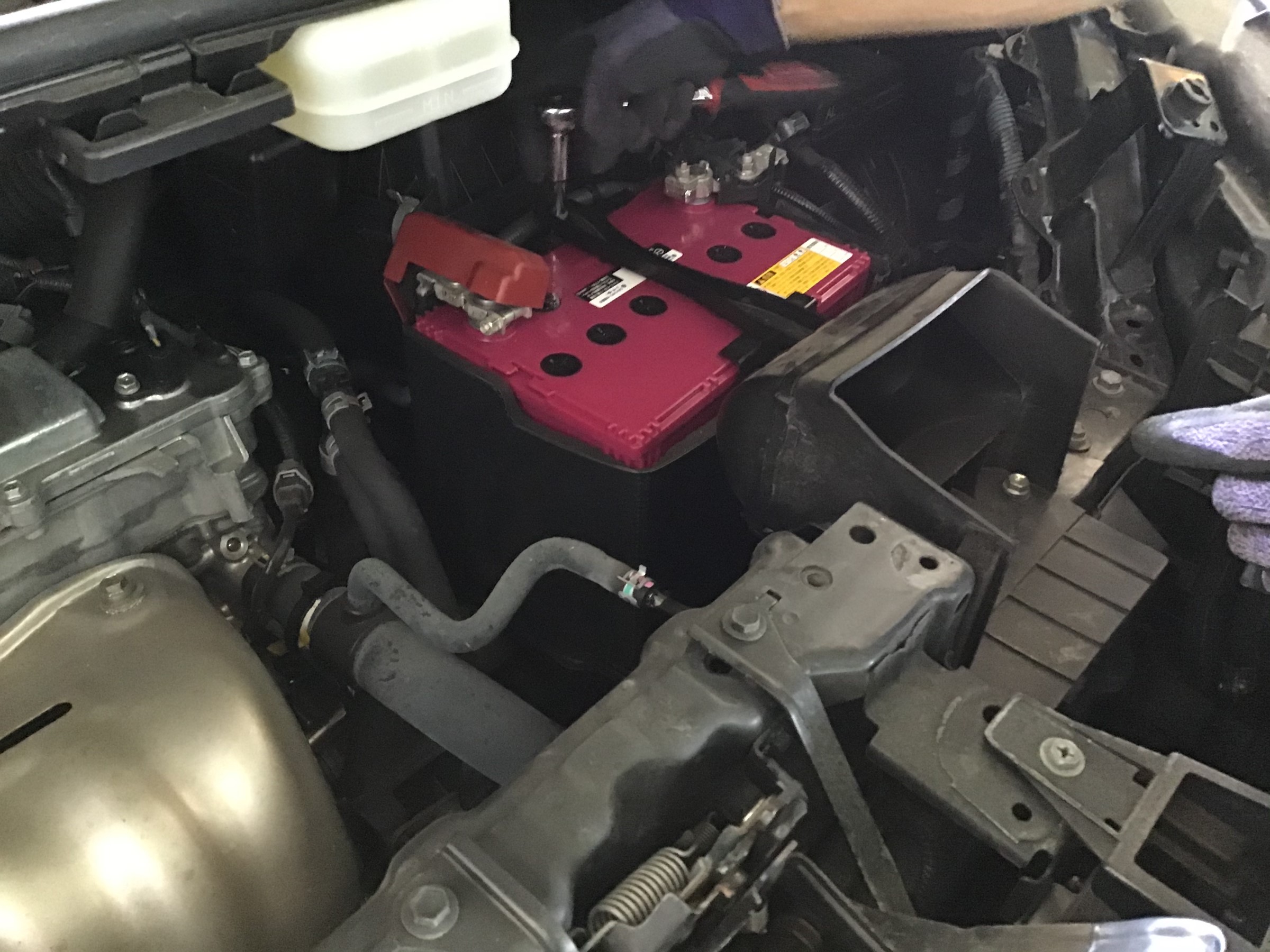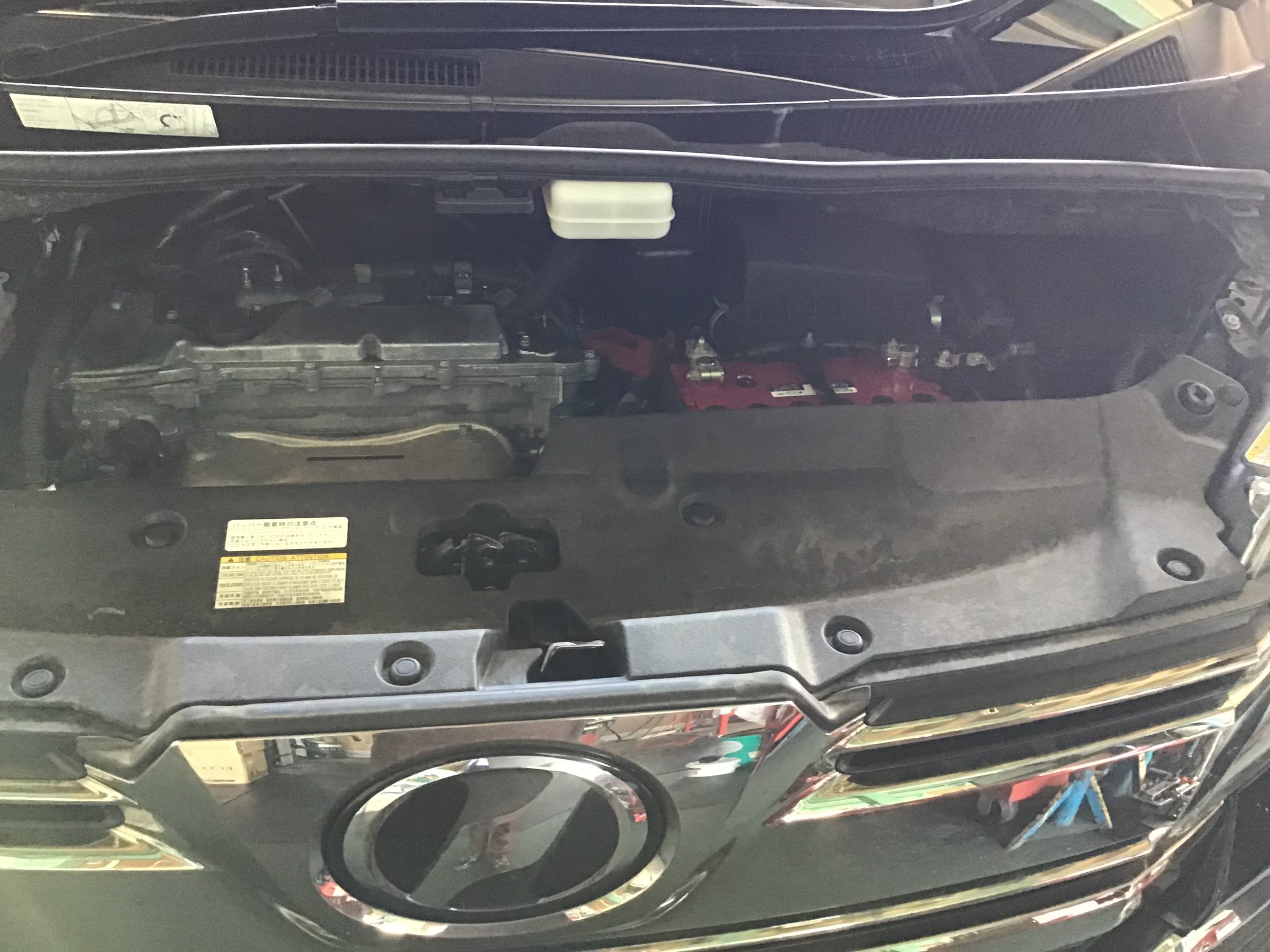 ①ボンネットを開けて、バッテリー付近のカバーを外します。