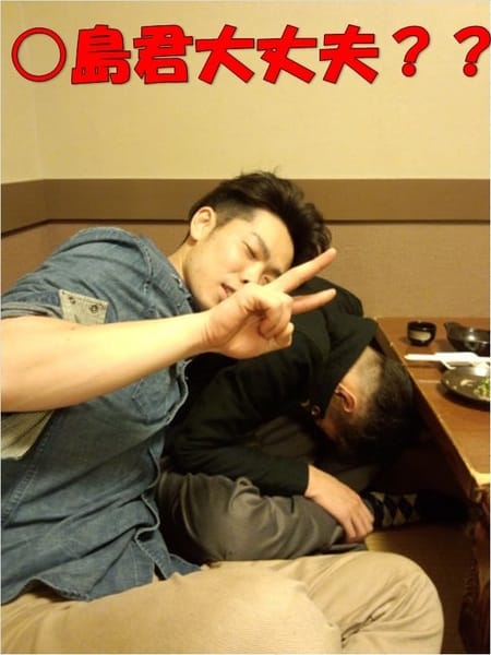 〆張を飲んだあたりからテンションがおかしくなってきた〇島君。
