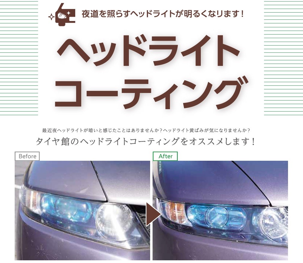 『ヘッドライトコーティング』 ポスト 近年のクルマのヘッドライトレンズはほとんどが樹脂製で、紫外線や点灯時の熱の影響による経年劣化で黄ばみやくすみが発生します。放っておくとひび割れが発生することがあり、そのままでは光量不足を招いて車検に通らないこともあります。ヘッドライトコーティングは、表面のコートを剥離し、丁寧に研磨したあとにコーティングを施し、より美しく仕上げ耐久性を高めます。 関連動画 カテゴリ:商品情報 その他商品・サービス