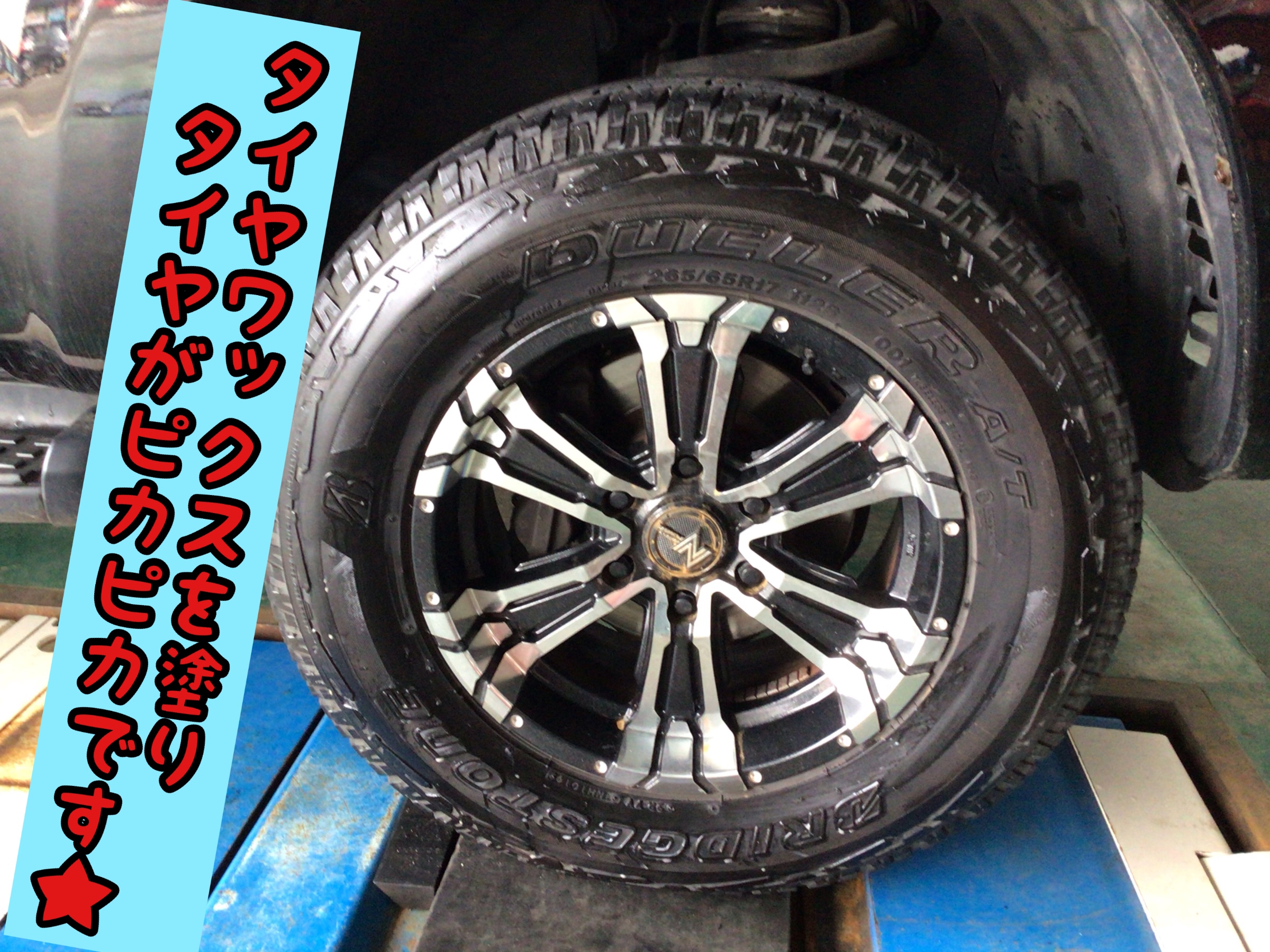 タイヤワックスを塗り、