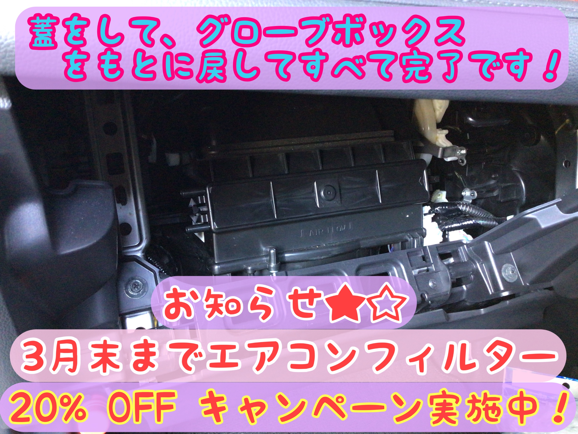 花粉対策してますか?? ポスト 2022年3月27日 3月末まで、この時期には 嬉しいキャンペーン実施中♡ エアコンフィルター20%OFF キャンペーンやってますよ★☆ 今回の作業内容はこちら★☆ 【【ホンダ フィット】】 エアコンフィルター交換! それでは、さっそく エアコンフィルター交換 を始めていきます(о´∀`о)! 入庫の際、ボンネット内の 点検もしっかり行います! すべてOKでした〜(*´꒳`*)! エアコンフィルターは、お車の グローブボックス内にあります! 使用済みの汚れ具合です!! ホコリや、汚れが挟まってます! こちらが新しい物です☆☆ さっそく交換していきます!! グローブボックス内に エアコンフィルターを設置 していきます(๑>◡<๑)★ 作業終了になります★☆ これから花粉などの時期に なりますので、ぜひこの キャンペーン中にいかがですか? #タイヤ館 #タイヤ交換 #脱着 #上越 #新井 #糸魚川 #ブリヂストン #ブリジストン #レグノ #ポテンザ #プレイズ #エコピア #アレンザ #オイル交換 #ワコーズ #バッテリー #ワイパー #防錆 #アライメント