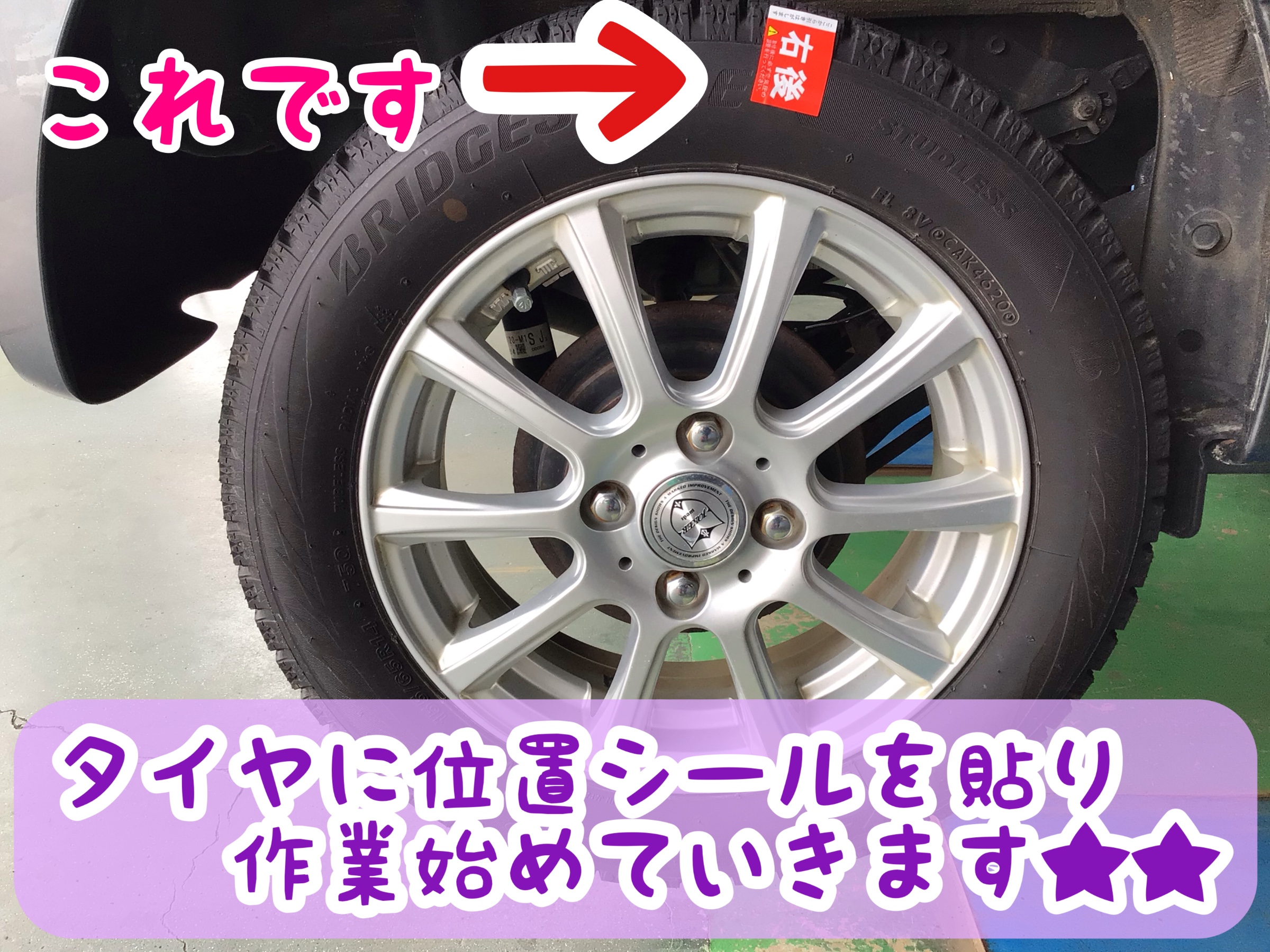 タイヤに位置シールを貼り