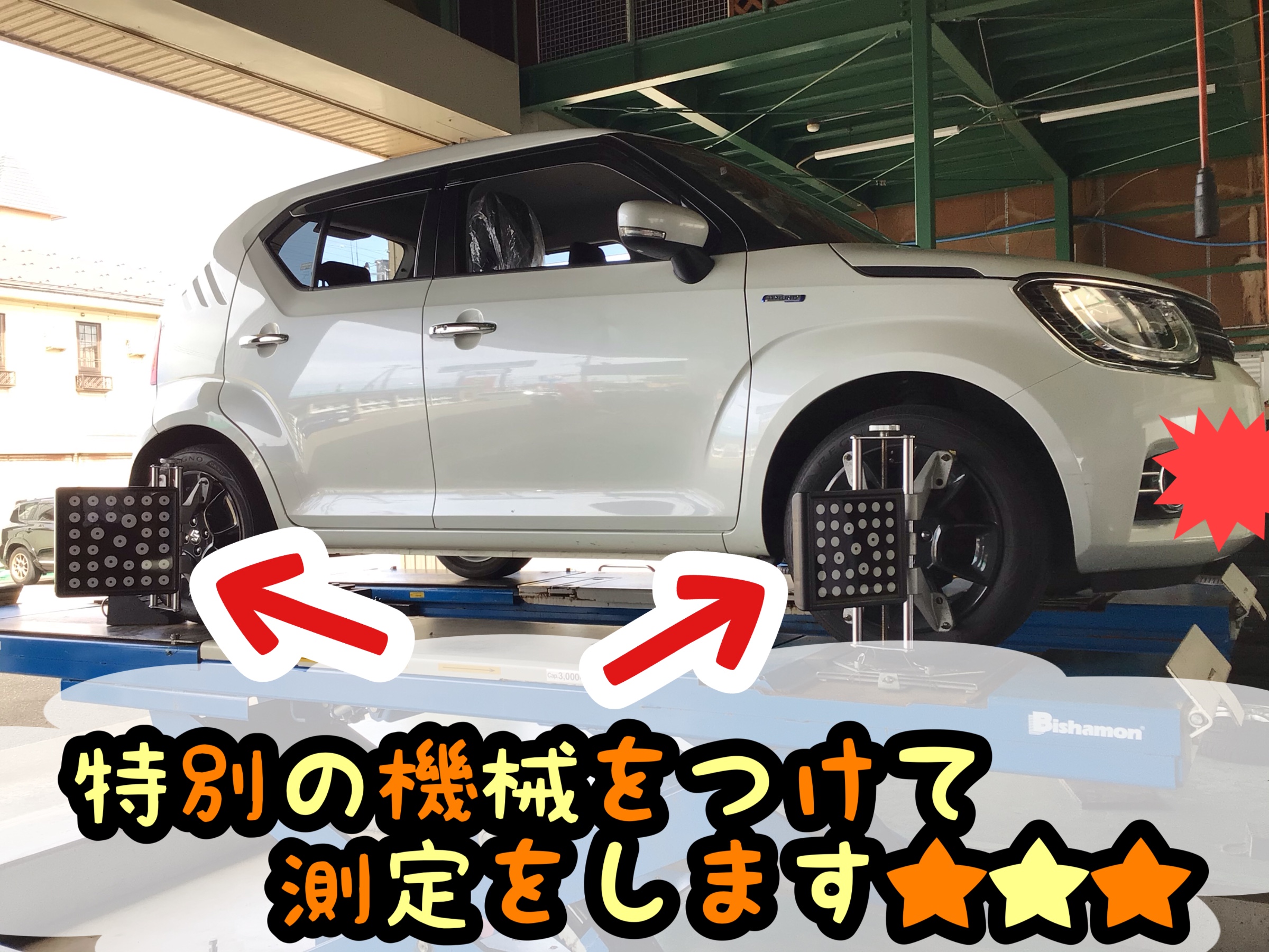 ターゲットを取付けたら車を前後に動かし、ハンドルを回して現状のデータを取ります!
