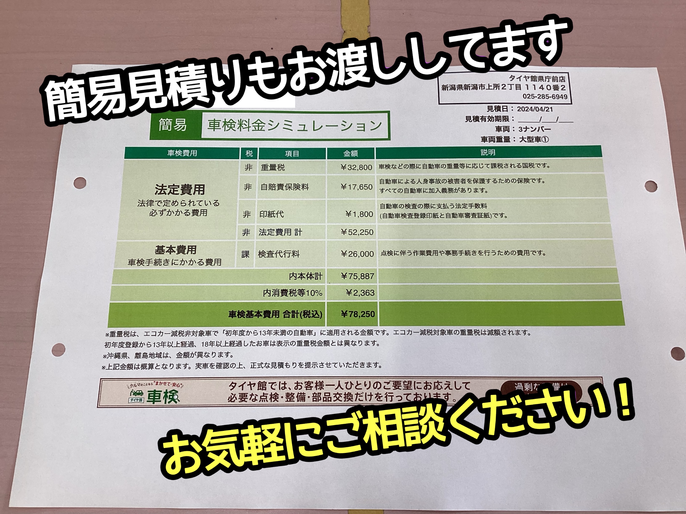 車検日が近い方には、簡易見積りをお渡ししてます