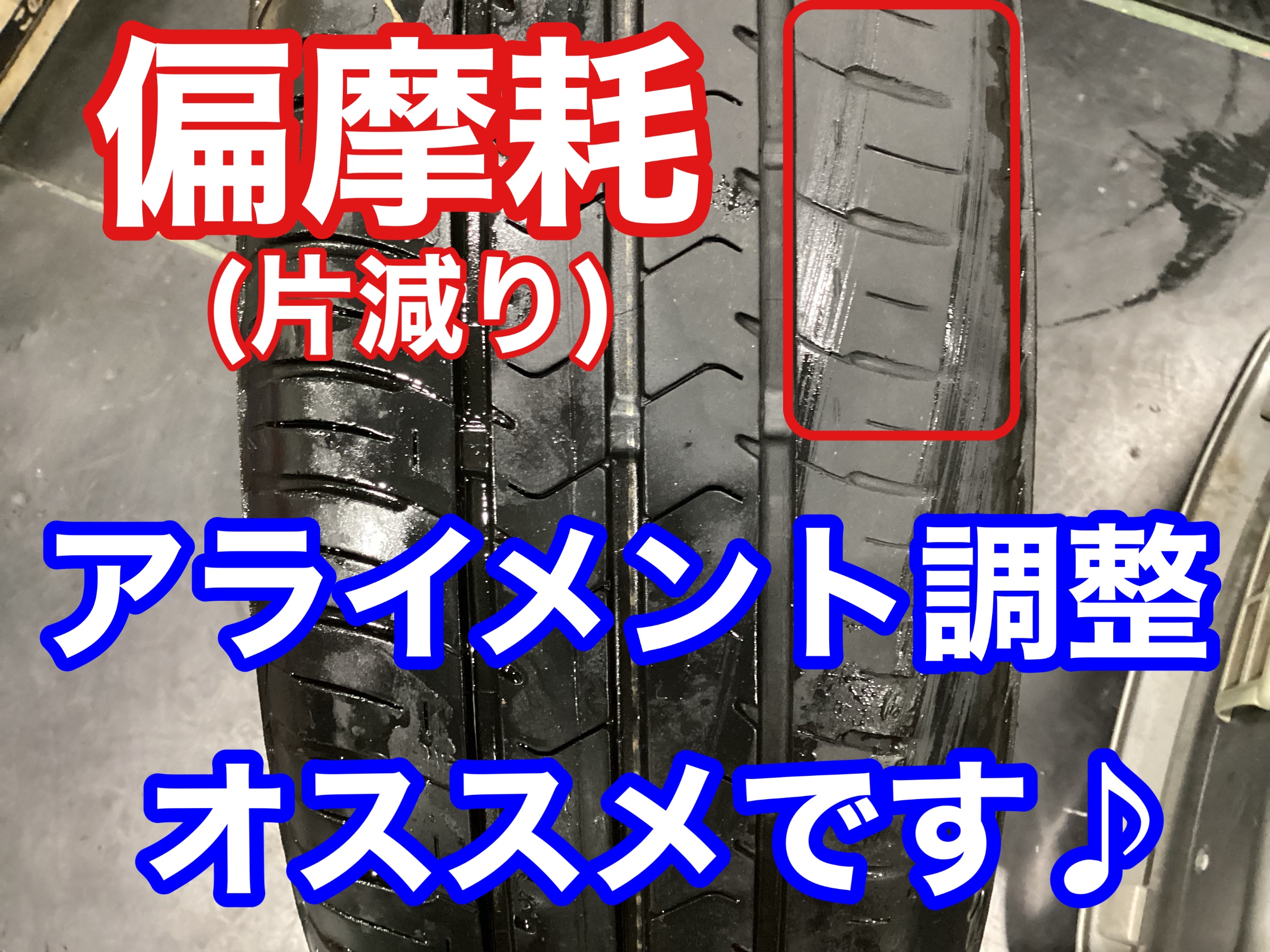 タイヤが偏った減り方をしており、せっかくの新品タイヤも