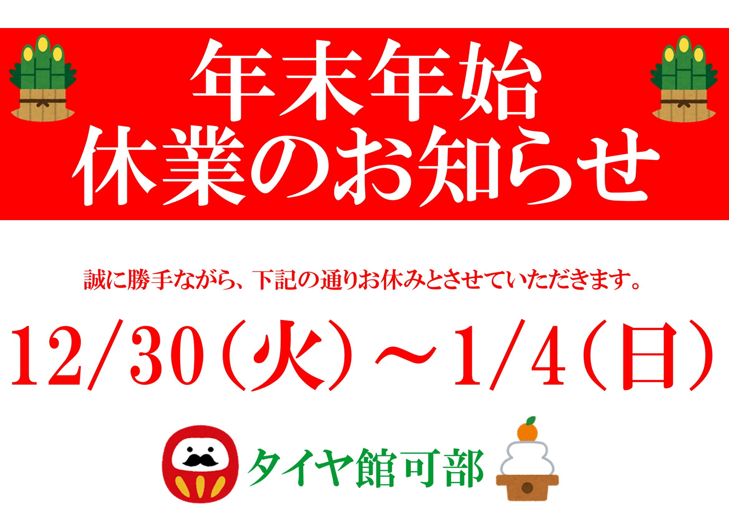 いつもタイヤ館可部店のご利用誠にありがとうございます。 誠に勝手ながら、年末年始の休業を以下の通りとさせていただきます。 休業期間: 12月30日(火)〜1月4日(日) 1月5日(月)より通常営業いたします。 年末年始に車のトラブルが起きないように 点検がおすすめです★ 休暇前の点検もタイヤ...