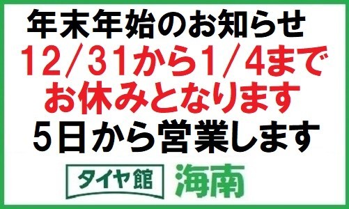 いつも当店をご利用頂きまして、誠にありがとうございます。 12月30日で年内の営業を終了させて頂きました。 本年もたくさんのご利用、誠にありがとうございました。 12月31日から1月4日までお休みとなります。 新年は1月5日からの営業となります。 また新春セールを開催します!! 夏タイヤ、スタ...