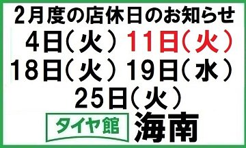 タイヤ館海南のホームページを 閲覧いただきありがとうございます☆ 火曜日と第3水曜日はお休みとなります。 また11日(火)は祝日ですが店休日となります。 よろしくお願い致します。