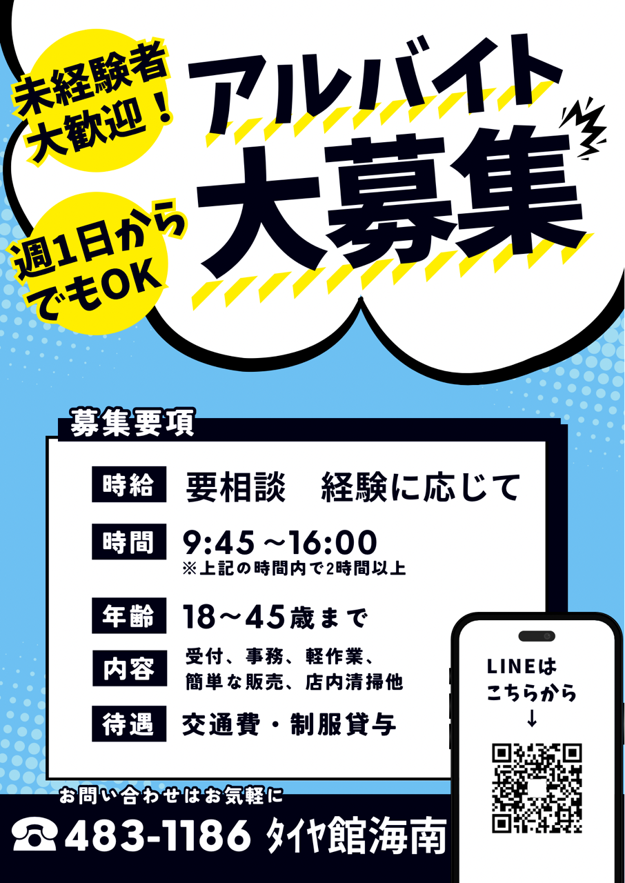 タイヤ館 海南店では現在、【パート、アルバイト】 を大募集しています。