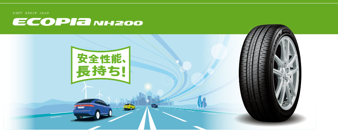 エコピアNH200シリーズ 車とともに進化する新車装着タイヤと同じく、 車の性能を引き出すために進化した新しい「エコピア」です。 エコピアNH100シリーズ比較で 1.低燃費性能が進化 「エコテクノロジー構造」を採用しエネルギーロスの低減 各部材のバランスを最適化 2.雨の日の性能(ウェット性...