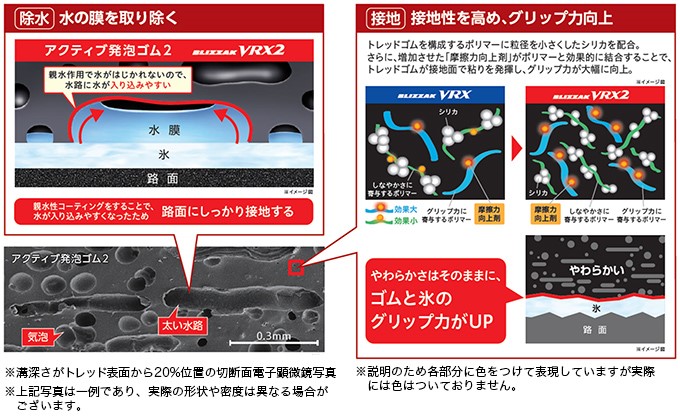 これによって従来のVRX対比「氷上ブレーキ10%短縮」、「摩耗ライフ22%向上」、「静粛性向上(騒音エネルギー31%低減)」と大幅に性能を向上。さまざまな冬道でより“しっかり曲がり、止まり”、“静かで”、“長く使える”、ブリザック史上最高性能を実現しているんです。また、装着初期から優れた氷上性能を確保するため、「マイクロテクスチャー」という微細な凹凸をトレッド表面に施し、高い除水性能を実現しているのも特長です。