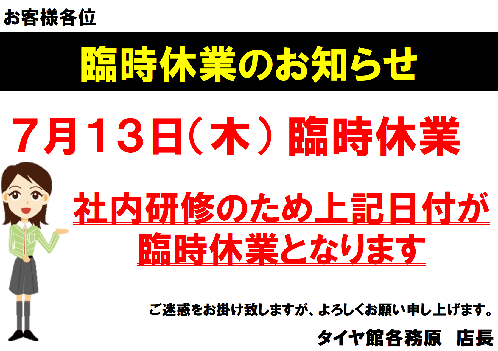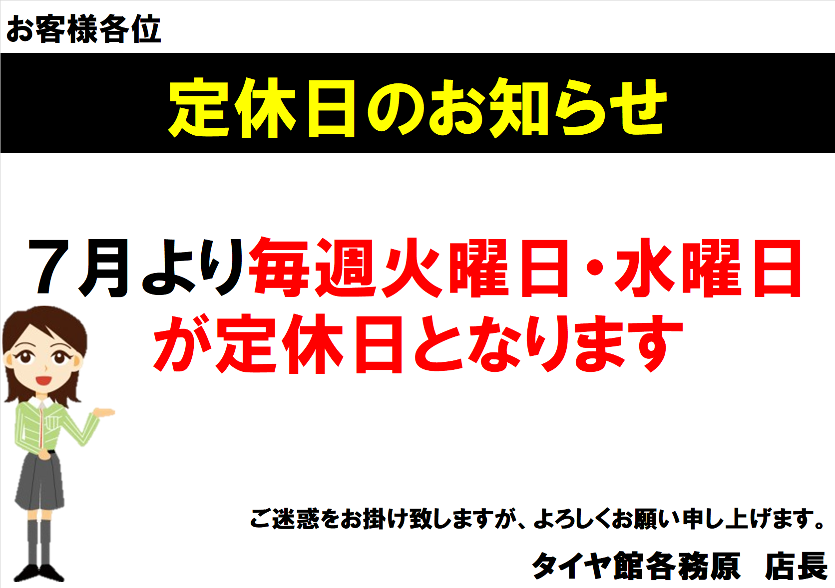 2023年7月の店休日のお知らせ ! ポスト 2023年7月1日 いつもタイヤ館各務原店をご利用いただき誠にありがとうございます。 2023年7月の店休日のご案内です。 7月より毎週火曜日と水曜日が定休日となります。ご注意ください! 7月4日(火)・5日(水)・12日(水)・13日(木)・ 18日(火)・19日(水)・25日(火)・26日(水)が店休日となります。 11日(火)は臨時営業となります。 13日(木)は社内研修のため臨時休業日となります。 よろしくお願い致します。 カテゴリ:お知らせ
