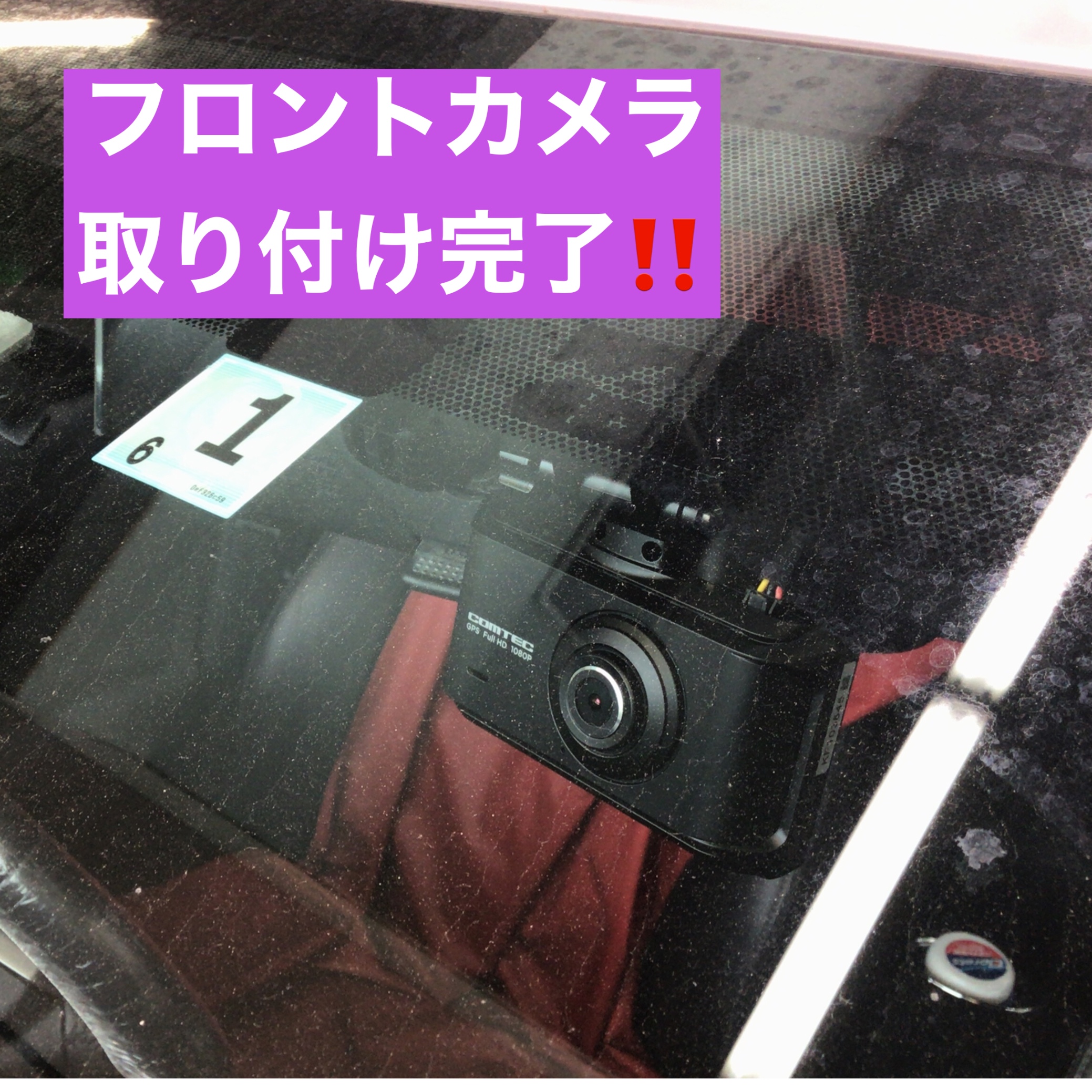 フロントカメラはルームミラーの裏側に取付ました。