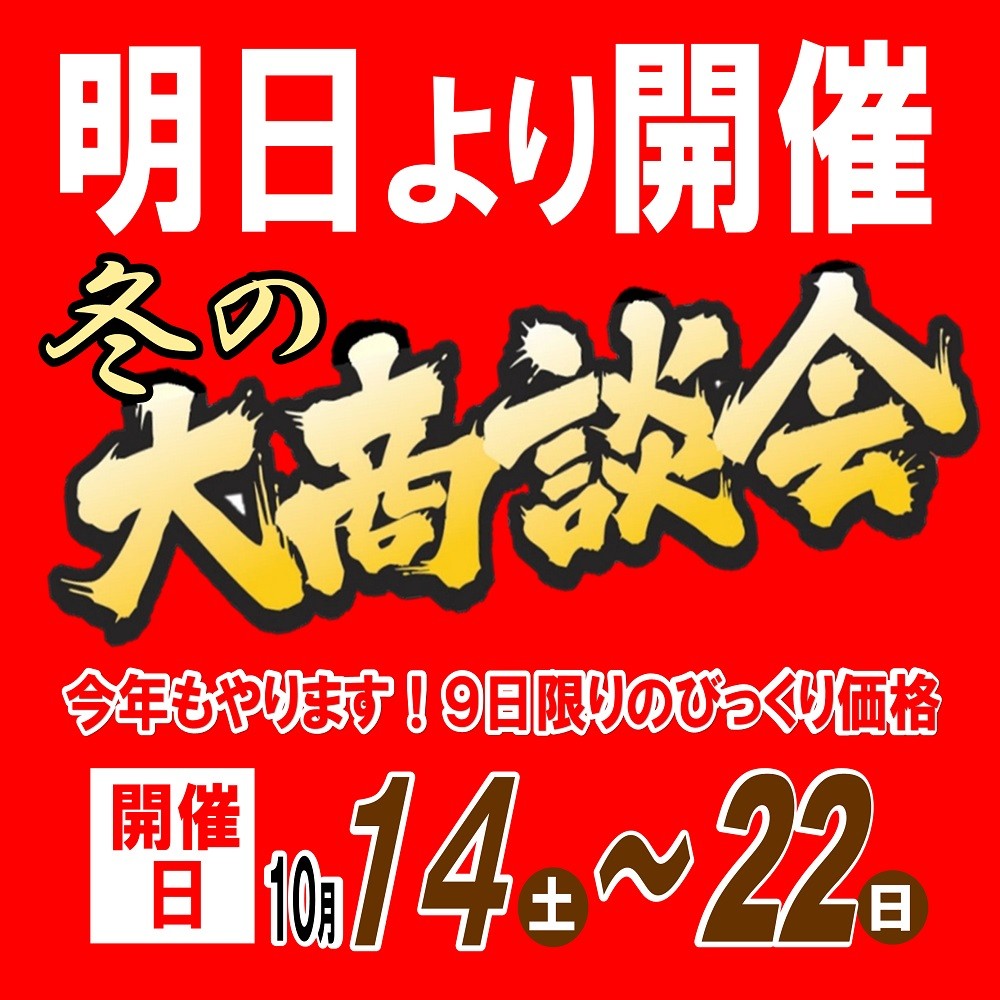 【明日より開催】冬の大商談会を開催させていただきます! ポスト 2023年10月13日 今年もやります!☆大商談会☆(^_-)-☆ 冬の準備はお早目に!! 冬本番前!お買い得な蔵出し品も早いもの勝ちっ!! 1年に一度のこの機会をぜひ!お見逃しなくっ!! カテゴリ:お知らせ