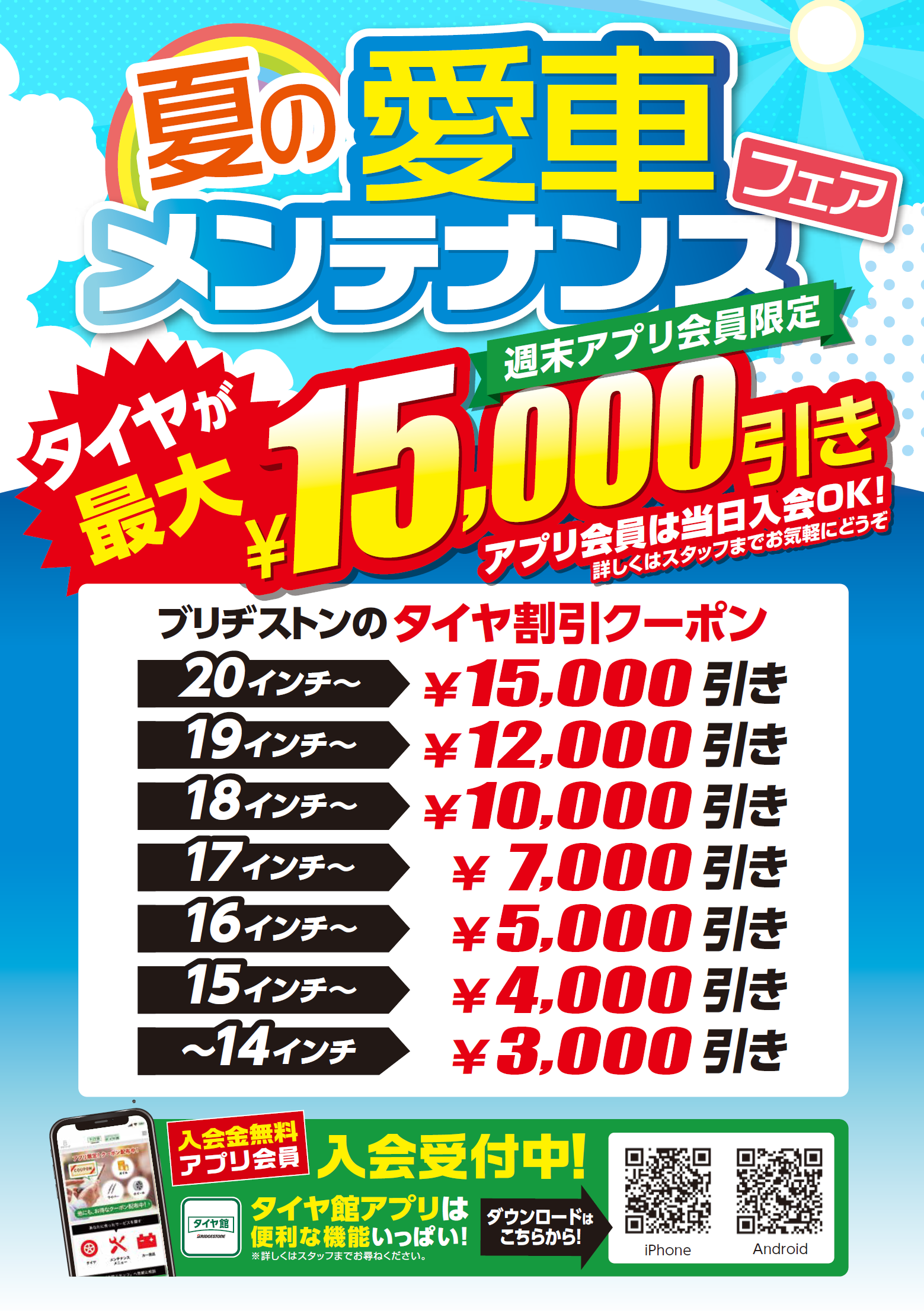 ☆この週末限定!お買得クーポン☆ ポスト 2023年7月15日 今週末限定!お買得クーポン情報!! タイヤ館アプリ会員の皆様はタイヤ4本セットが最大15000円割引!! タイヤ館アプリはもちろん当日入会OK!! この☆お買得☆チャンスをお見逃しなくっ!! ※サイズにより割引額が変わります。詳細はお気軽にお問い合わせください!