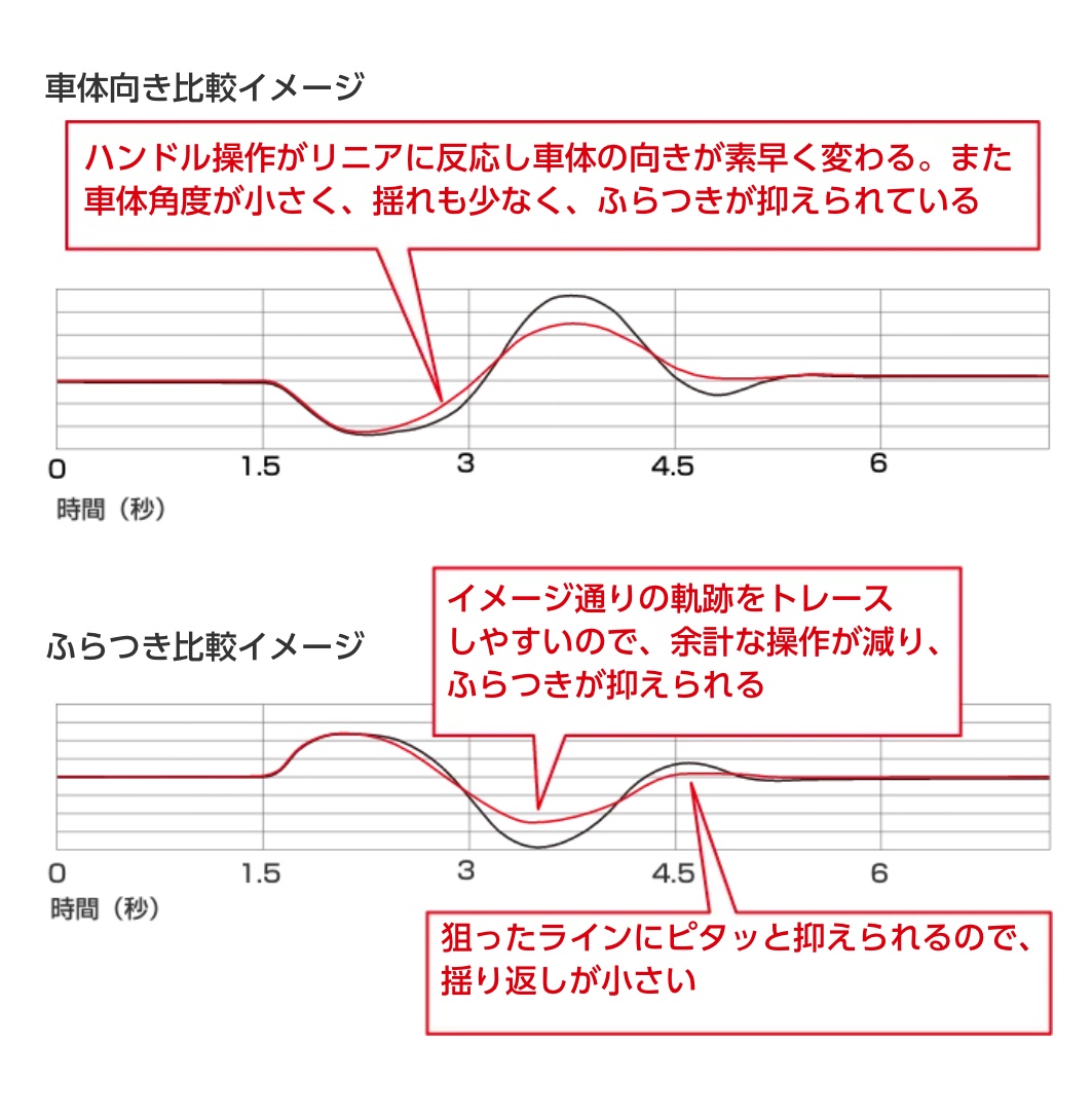 GR-tech Motionライン、ブリヂストン独⾃技術ULTIMATアルティメットEYEアイ®により接地面積を増やし、接地圧を分散することで接地性が向上。ハンドル操作に対して車体がリニアに反応する心地よいハンドリングを実現。また、レーンチェンジやコーナリング時の車体のふらつきを抑制することで揺れの少ない快適な車内環境を実現。