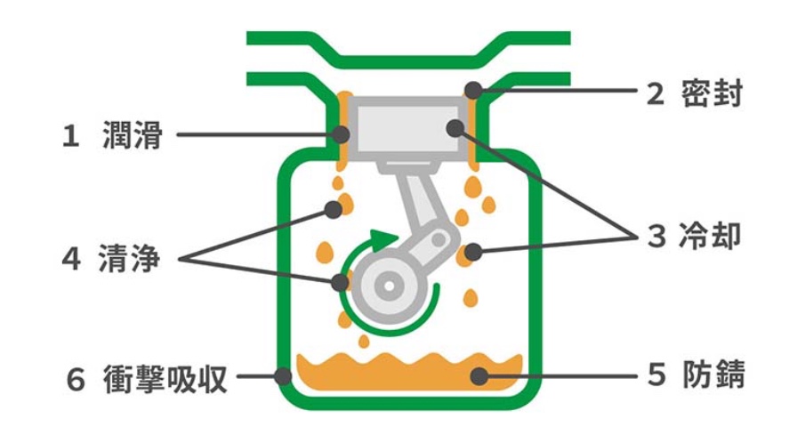 エンジンオイルの働きは、「潤滑」「密封」「清浄分散」「冷却」「防錆・防蝕」「衝撃吸収」。これを「エンジンオイルの6大作用」と呼んだりしますが、より簡単に説明すれば、エンジンを保護し、また動作をスムーズにする役目、そして冷却する役目があります!