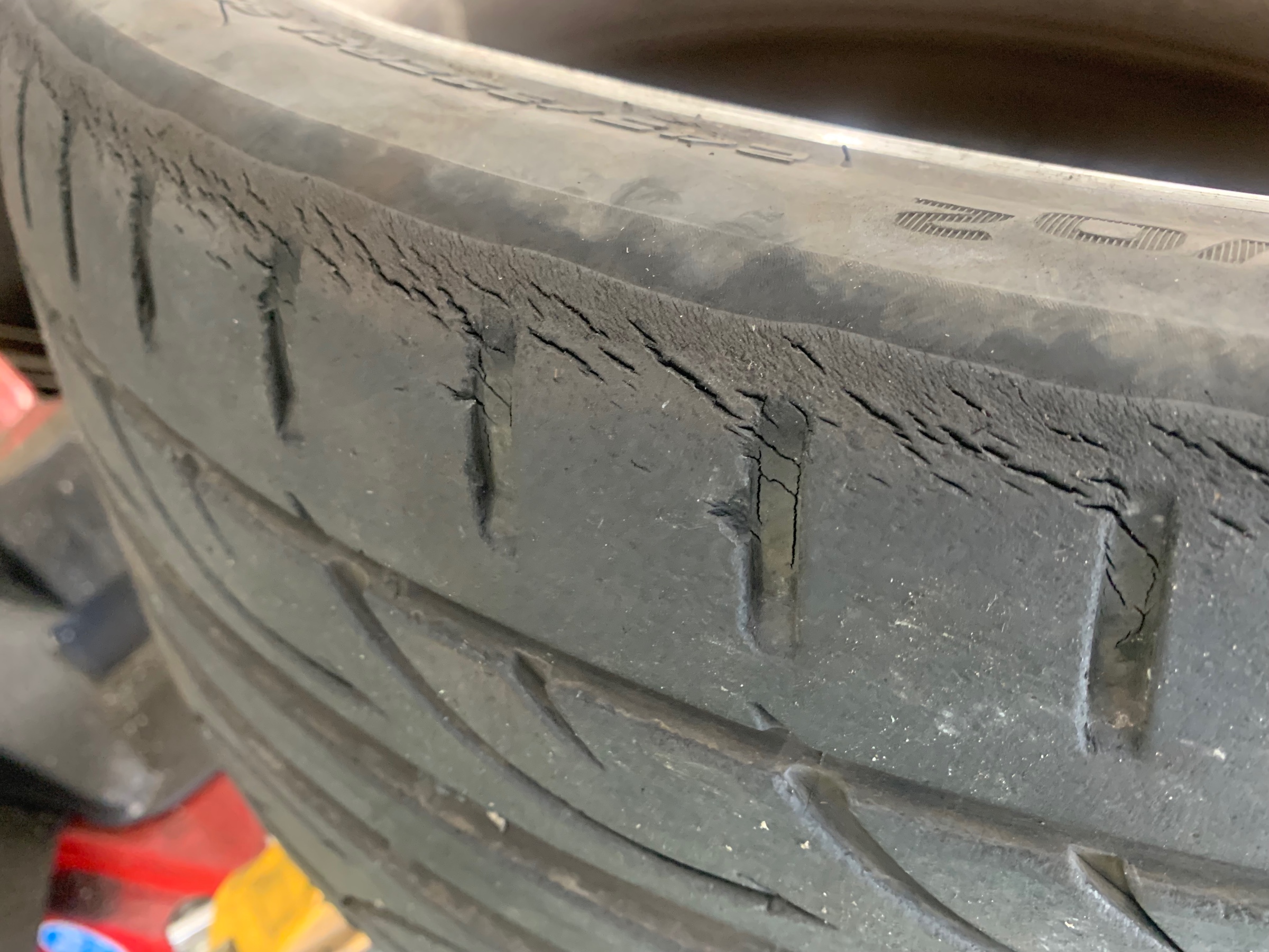 亀裂やタイヤ傷によっても検査落ちの場合がありますが、車検時に傷が浅く合格して、だんだん上記のような傷になったりもします。