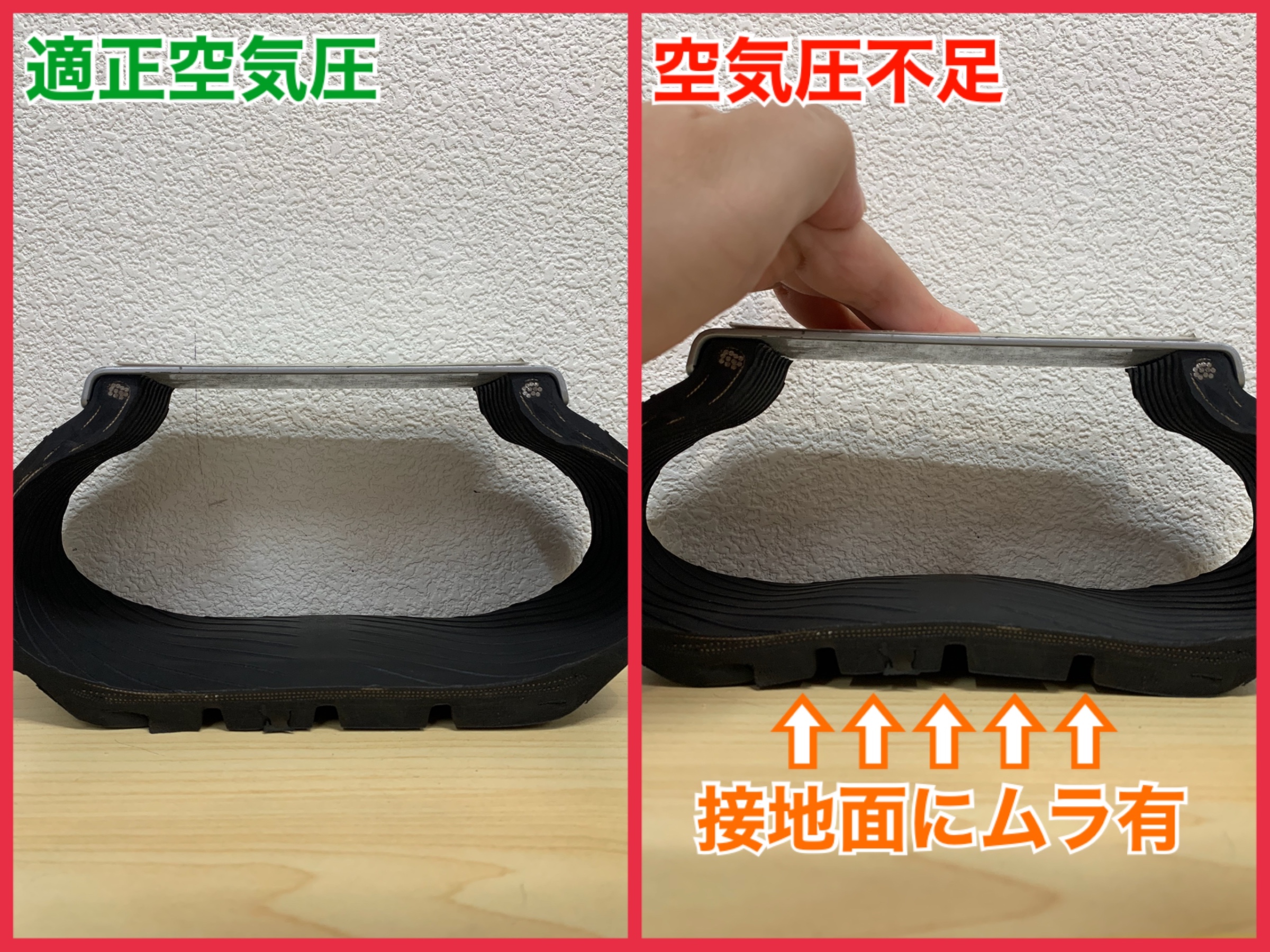 上から圧力がかかった時、適正空気圧の方は剛性がしっかりとあり重量を支えられていますが、空気圧不足の方はたわみが生じ、接地面にムラが発生しています。