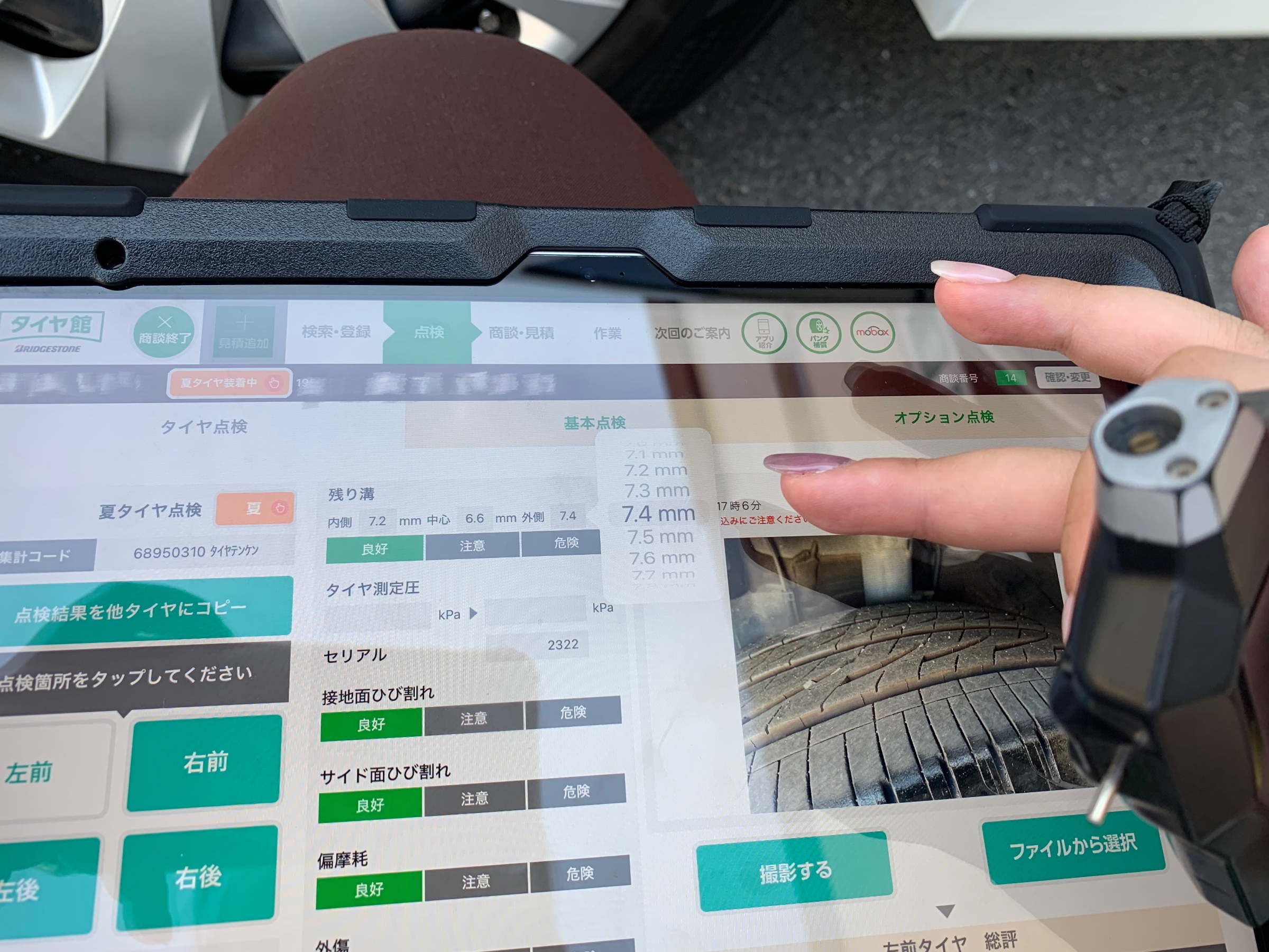 ↑タイヤの状態を細かく点検した後、タブレットへと記録